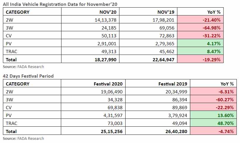 According to the data released by the Federation of Automobile Dealers Associations (FADA), the new vehicle registrations saw a YoY decline of 19.29% in November 2020. The two-wheeler registrations saw a decline of over 21%. However, on MoM basis, the auto industry saw a growth of 29.32% last month.