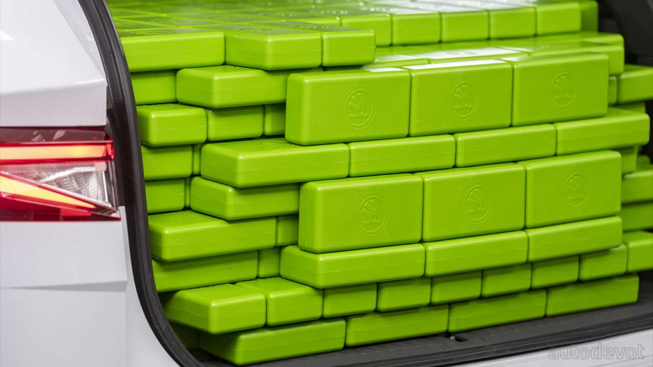 These 1-litre green blocks measure 20 × 10 × 5 centimetres and arranging them is governed by a technical standard (ISO 3832, if you must know). You can’t just cram them the way you want or wherever you want; the rules also dictate how far the blocks can go, and they can be stacked just until the height of the parcel shelf. Yes, the space beneath the luggage compartment floor is included as well.