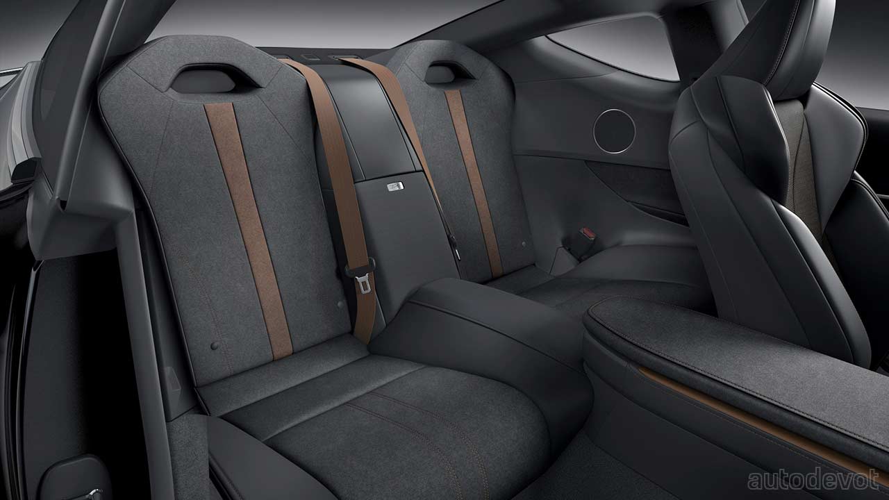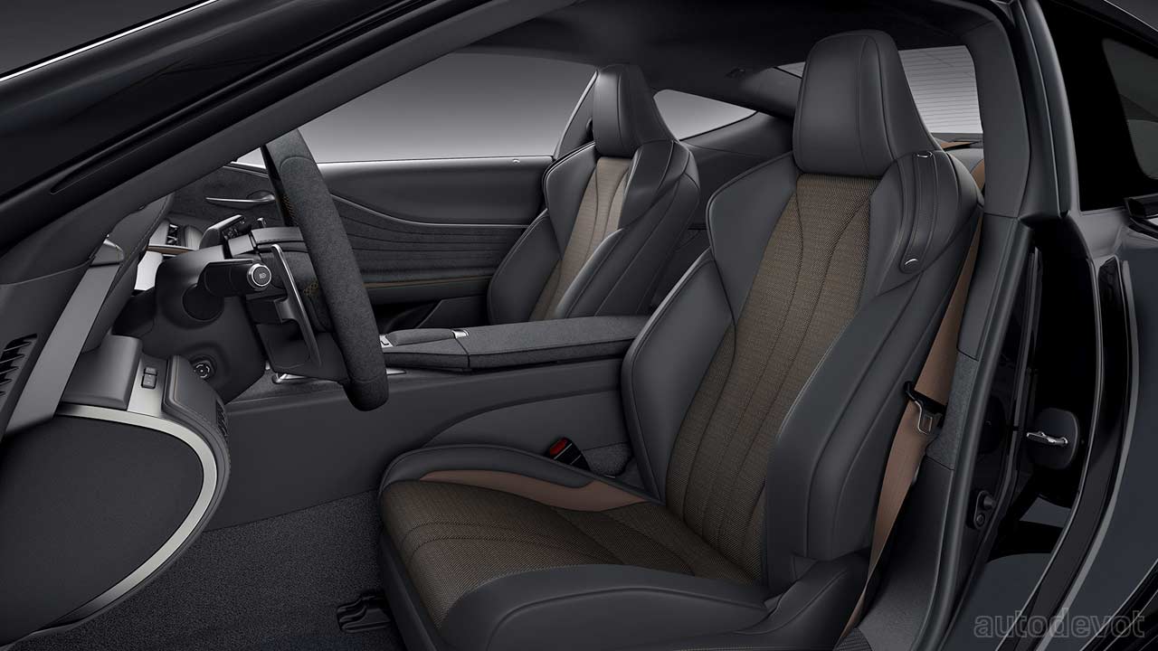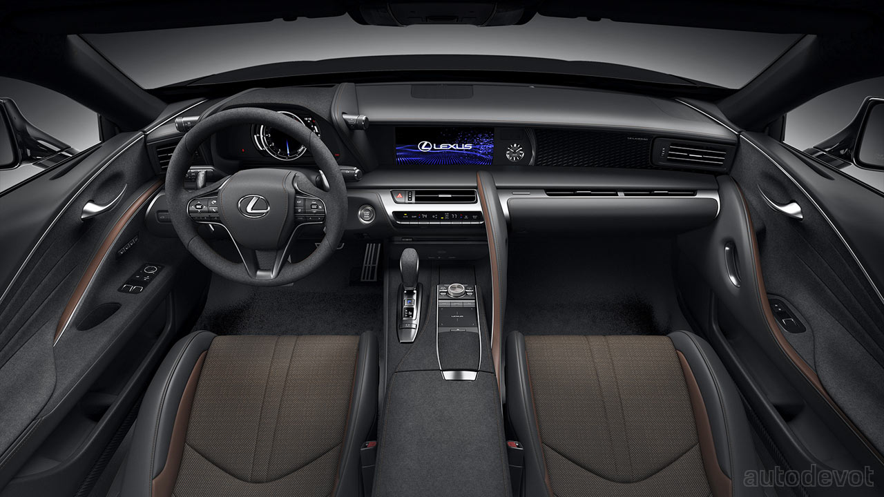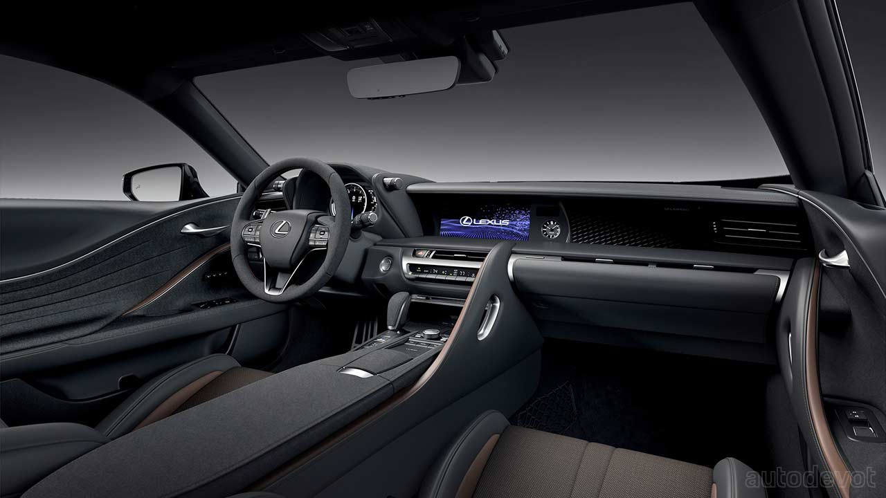 The cabin too is mostly drenched in black, with subtle Saddle Tan accents. Features include Alcantara-trimmed sport seats, standard Mark Levinson 13-speaker audio system, standard color Head-Up Display (HUD), and all the updates made on the 2021 model year LC 500, including the standard Lexus Safety System+ suite of safety and driver assistance systems.