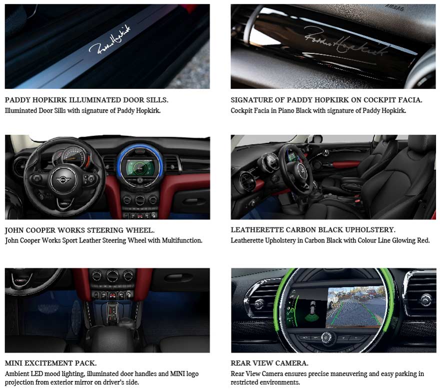 Named after the former Irish rally driver Paddy Hopkirk, the special edition car pays homage to 30-year-old Paddy’s victory in the classic Mini Cooper S No. 37 at the Monte Carlo Rally in 1964. The car is finished in Chilli Red with Aspen White roof and Black mirror caps. Besides his signatures, there’s a subtle 33EJB embossing on the bonnet stripe, which was his license plate number.