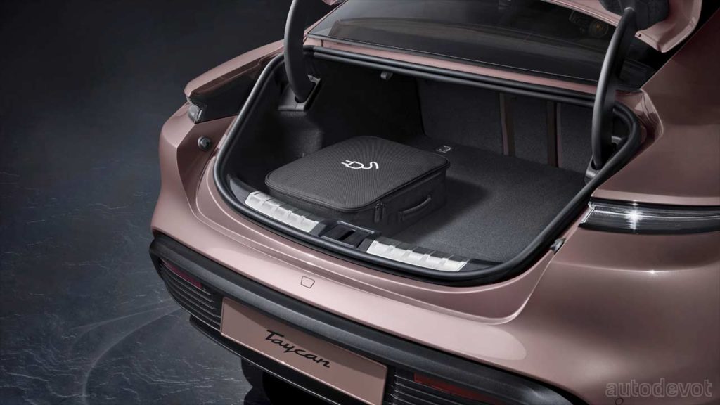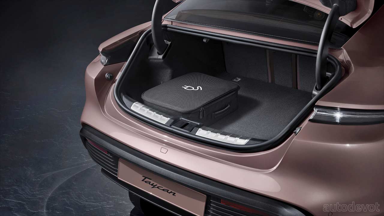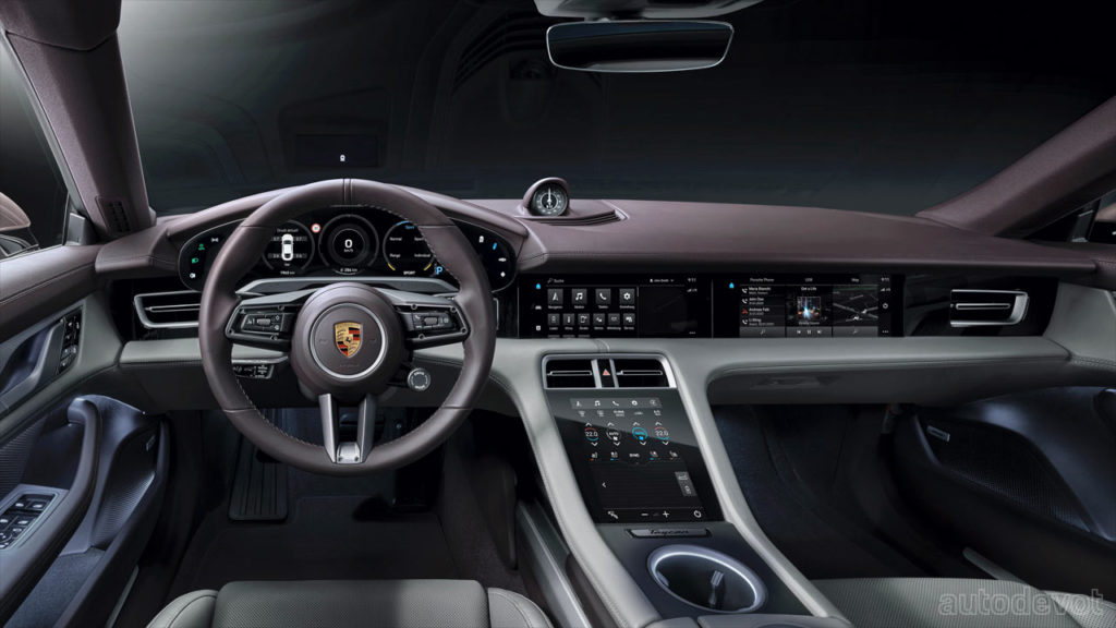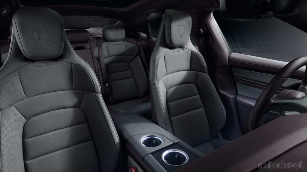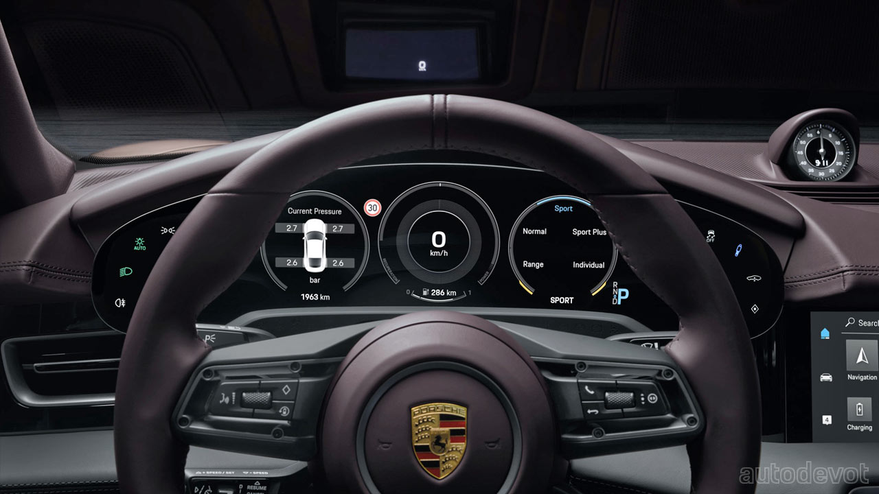In the cabin, the Taycan gets partial leather upholstery as standard and so are the front comfort seats with 8-way electrical adjustment. Other features include a 10.9-inch infotainment display, an optional display for the front passenger, and optional color HUD. The three-chamber adaptive air suspension is optional as well.