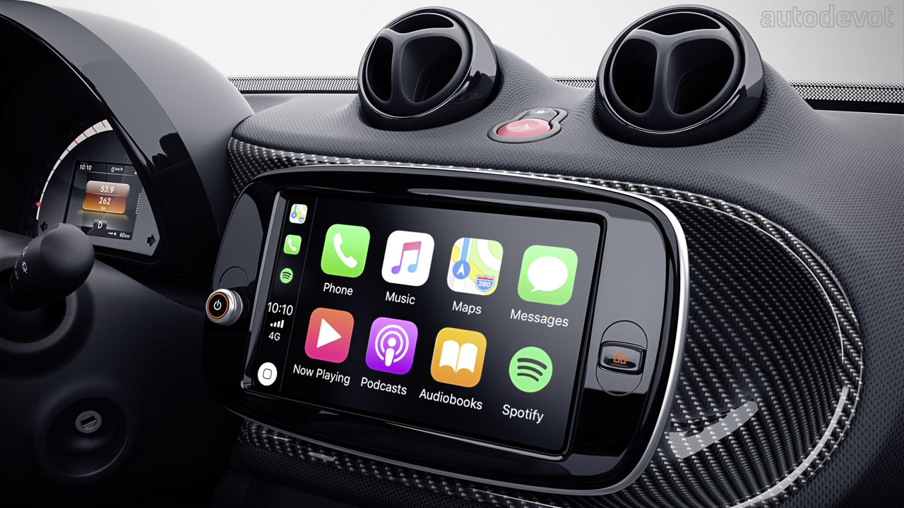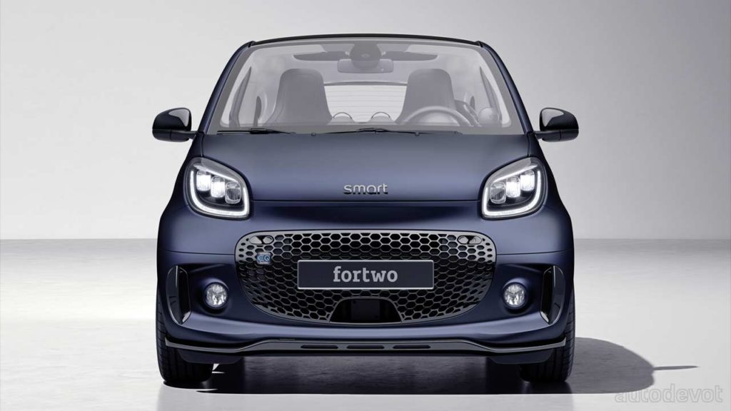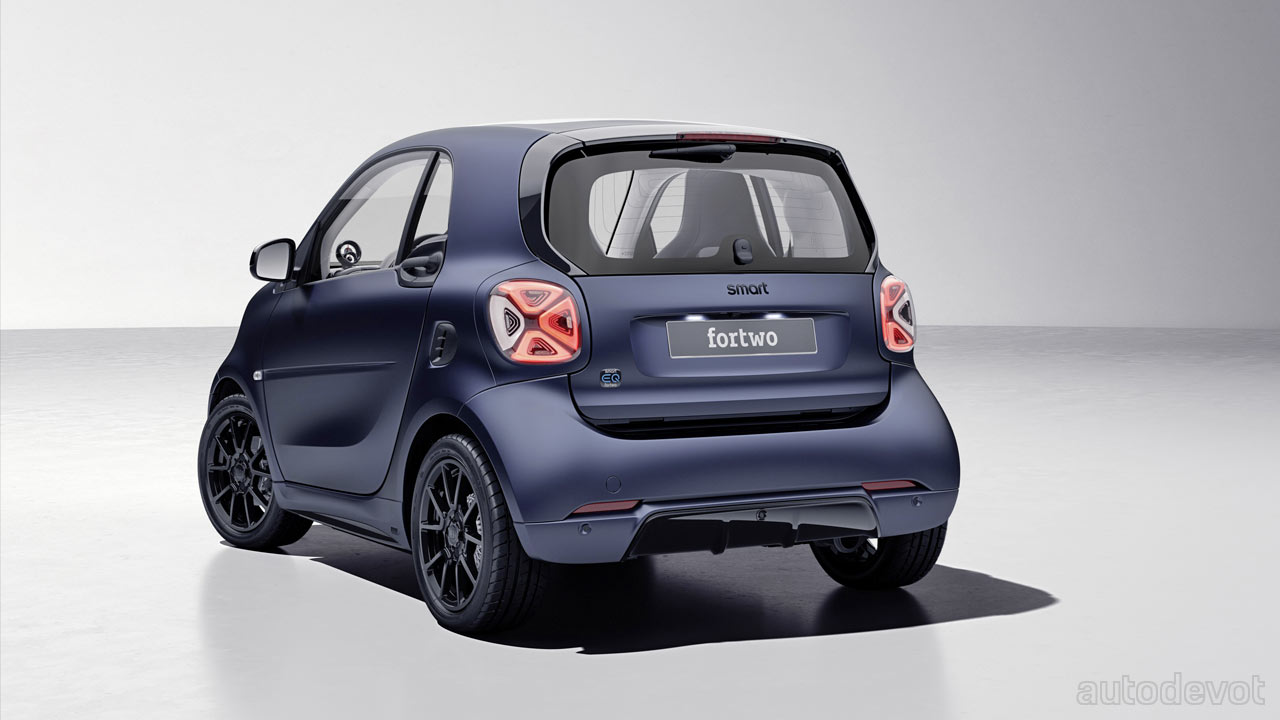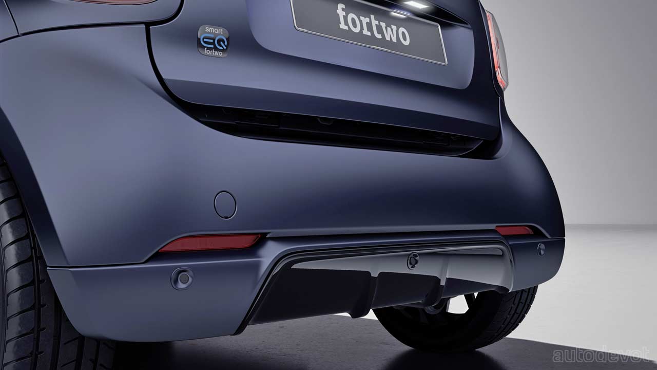 No mechanical changes. The EQ fortwo is powered by a single electric motor at the rear that develops a maximum of 60 kW (82 metric hp) and 160 Nm (118 lb-ft) of torque. It can do a top speed of 130 km/h (81 mph). The 17.2 kWh battery pack is good for a WLTP range of up to 130 km (81 mi).