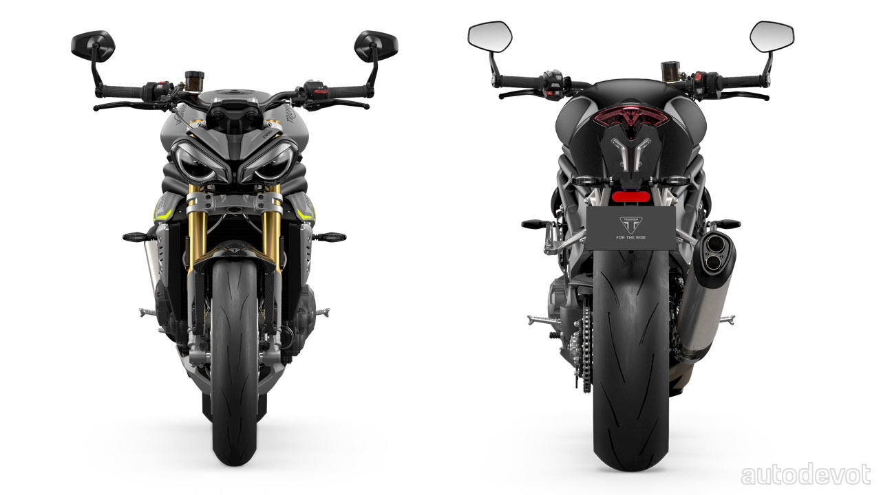 Features include full-LED lighting, 5-inch TFT display, keyless system, cruise control, cornering ABS, 5 riding modes (Rain, Road, Sport, Track and Rider), traction control, 6-axis inertial measurement unit (IMU), Triumph Shift Assist up & down quickshifter, and Öhlins adjustable suspension system. Braking duties are handled by twin 320 mm floating discs at the front and a single 220 mm disc at the rear.