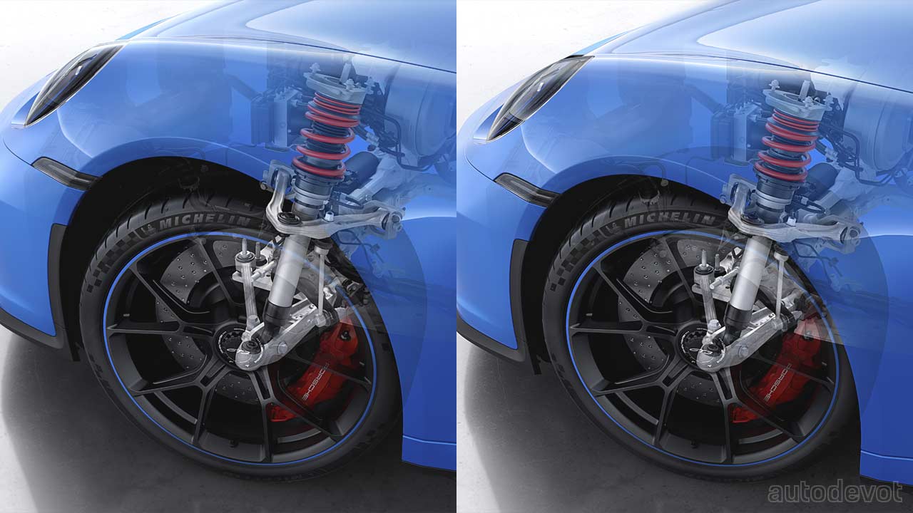 The rear diffuser is claimed to generate four times as much downforce as its predecessor and the overall downforce is claimed to be approximately 50% more than its predecessor, thanks to the swan-neck wing. In the performance position, the downforce can increase by as much as 150% at 200 km/h (124 mph), Porsche said. Also, notice that the front axle has double wishbone suspension as opposed to MacPherson struts in the regular models. Porsche Active Suspension Management (PASM) comes standard.