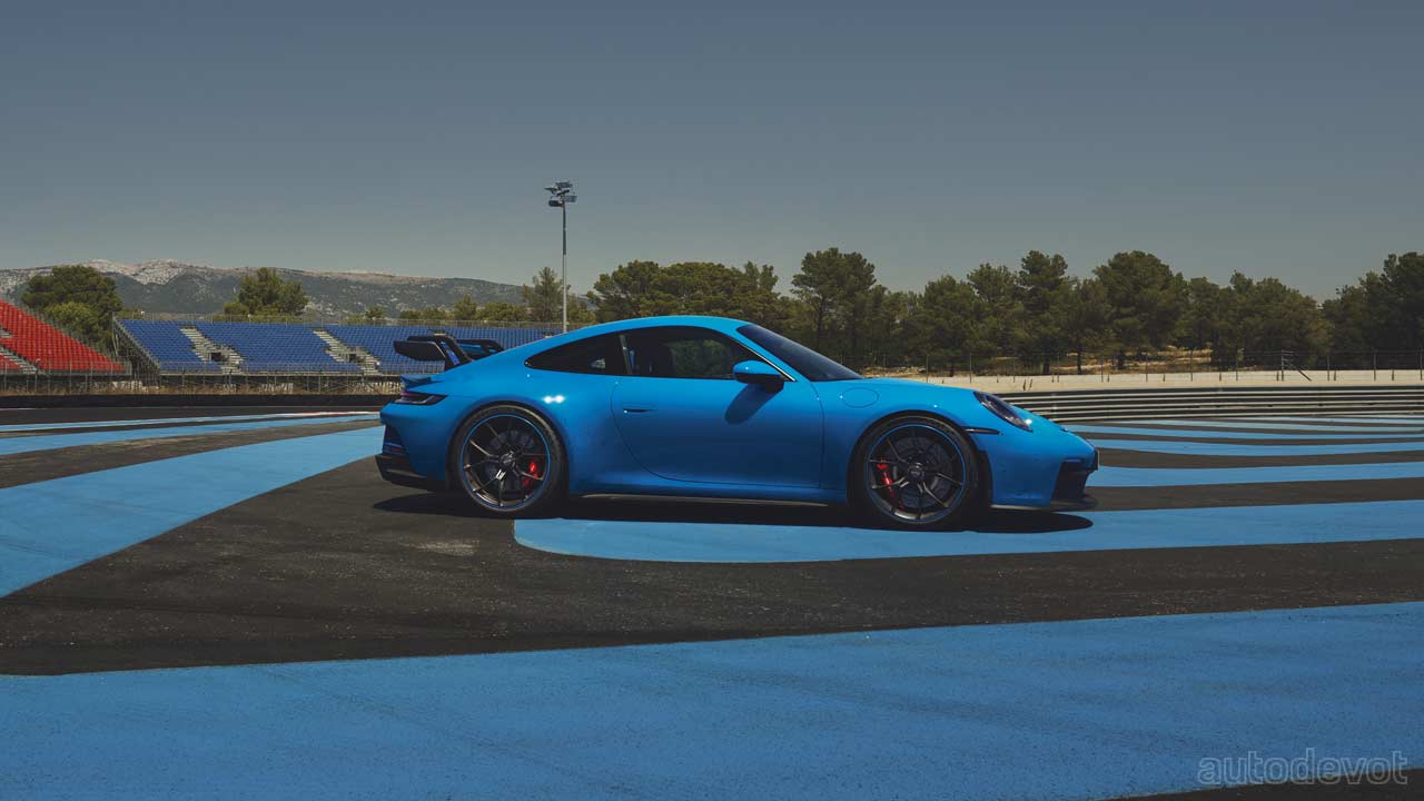 Braking duties are handled by larger 408 mm discs at the front, up by 28 mm, which are claimed to be 17% lighter compared to the ones on the last GT3. Rear discs measure 380 mm. The light-alloy wheels measure 20-inch at the front and 21-inch at the rear, shod with high-performance sports tyres measuring 255/35 at the front and 315/30 at the rear. The GT3 also gets the Smart Lift memory function for front-axle lift; the technology was introduced in the Taycan. Rear-wheel steering comes standard.