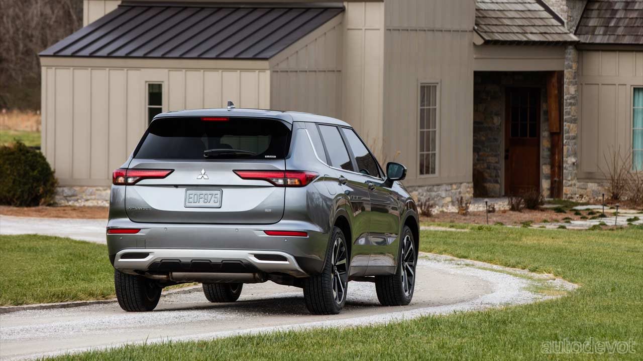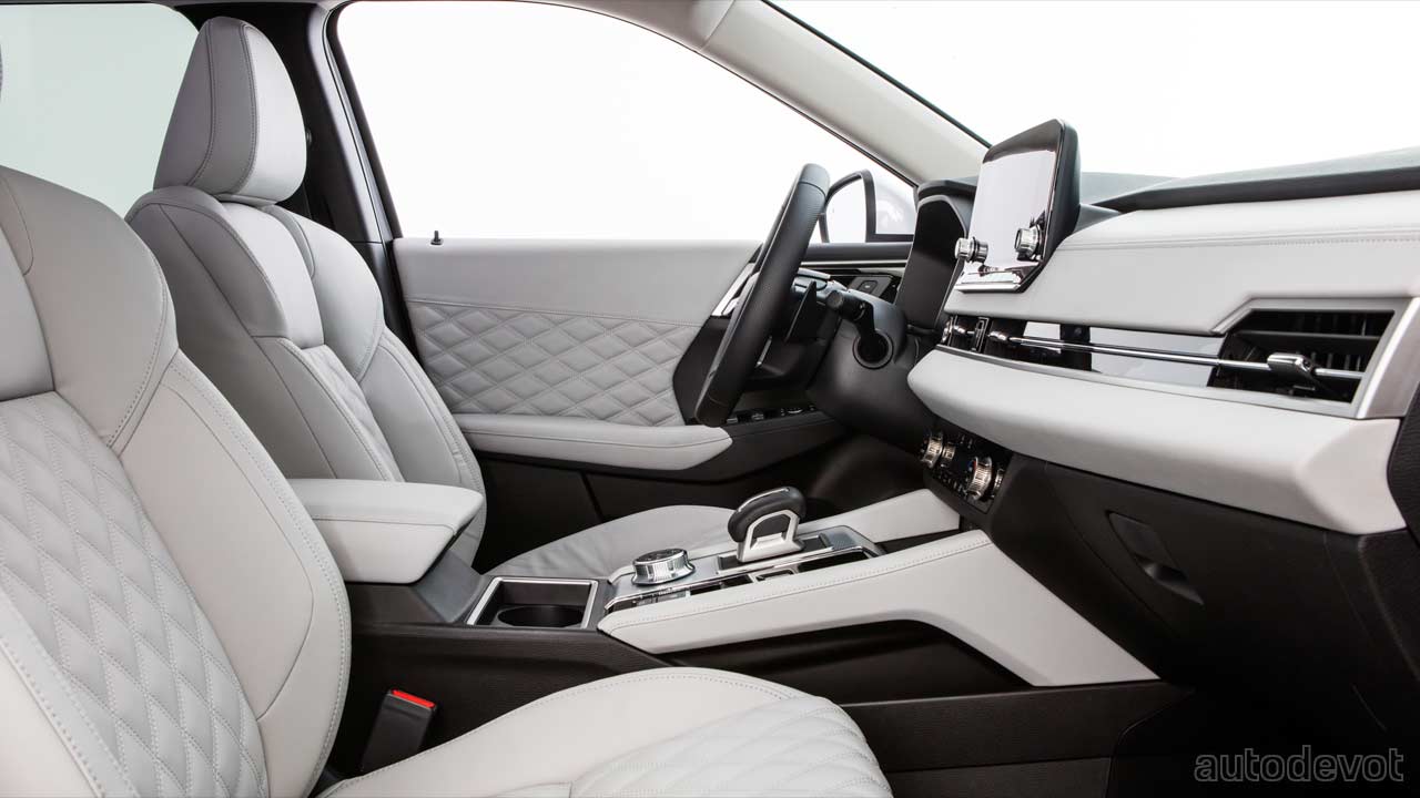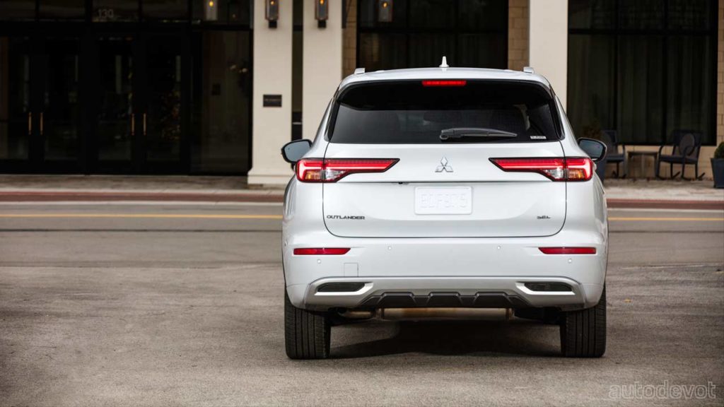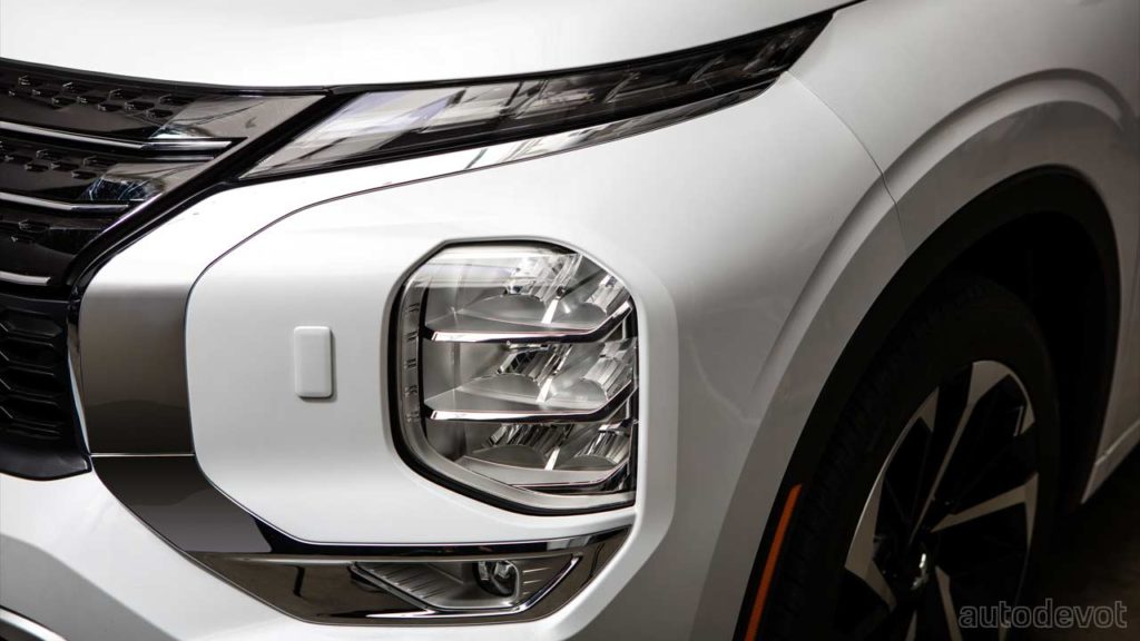 Exterior equipment includes LED headlights with three vertically arranged lights (two low beams at the top and a high beam at the bottom), front fog lights, 20-inch wheels, LED taillight signature, and a panoramic sunroof. For the U.S. market, the Outlander offers a total of 8 exterior colors: Red Diamond, White Diamond, Black Diamond, Sterling Silver, Titanium Gray, Black, Cosmic Blue and Deep Bronze.
