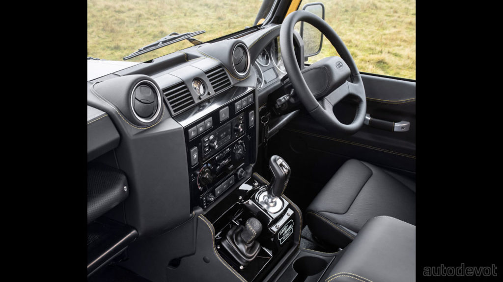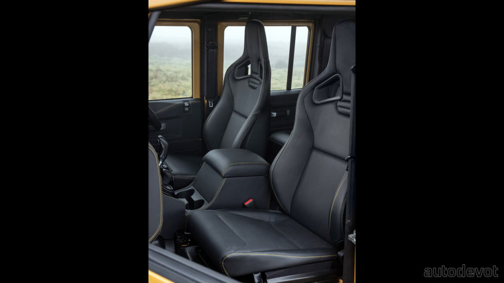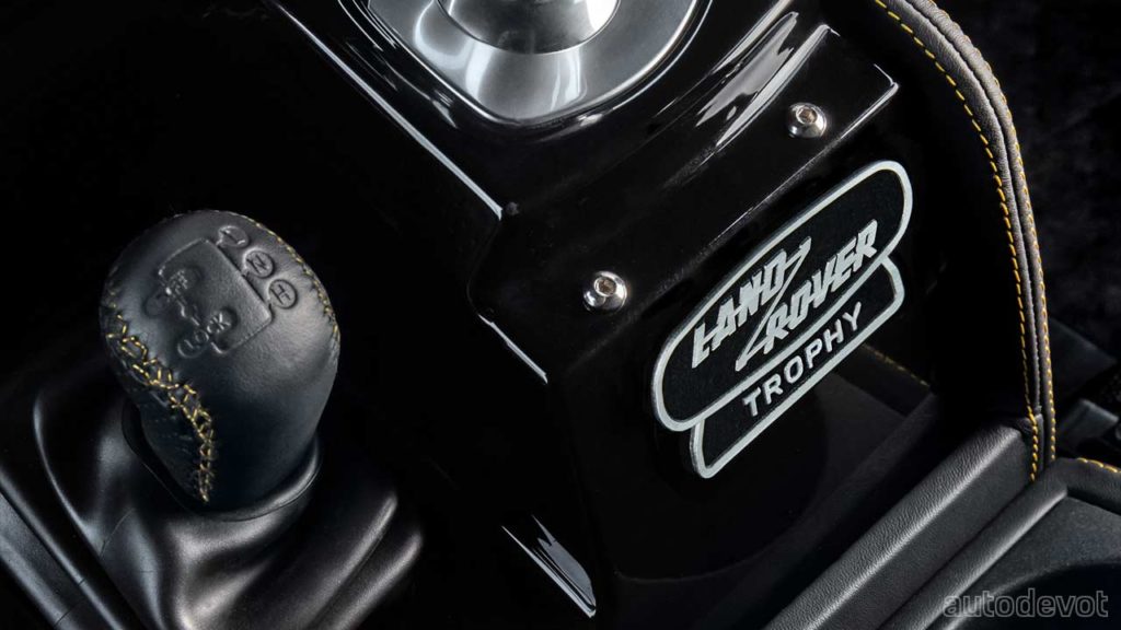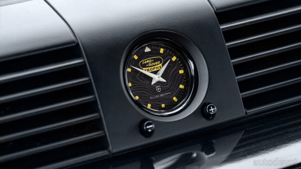 Inside, the V8 Trophy gets full black Windsor leather upholstery with Recaro sports seats, contrast yellow stitching and a bespoke Land Rover Trophy clock face by Elliot Brown. A classic infotainment system with integrated navigation and mobile device connectivity is also installed.