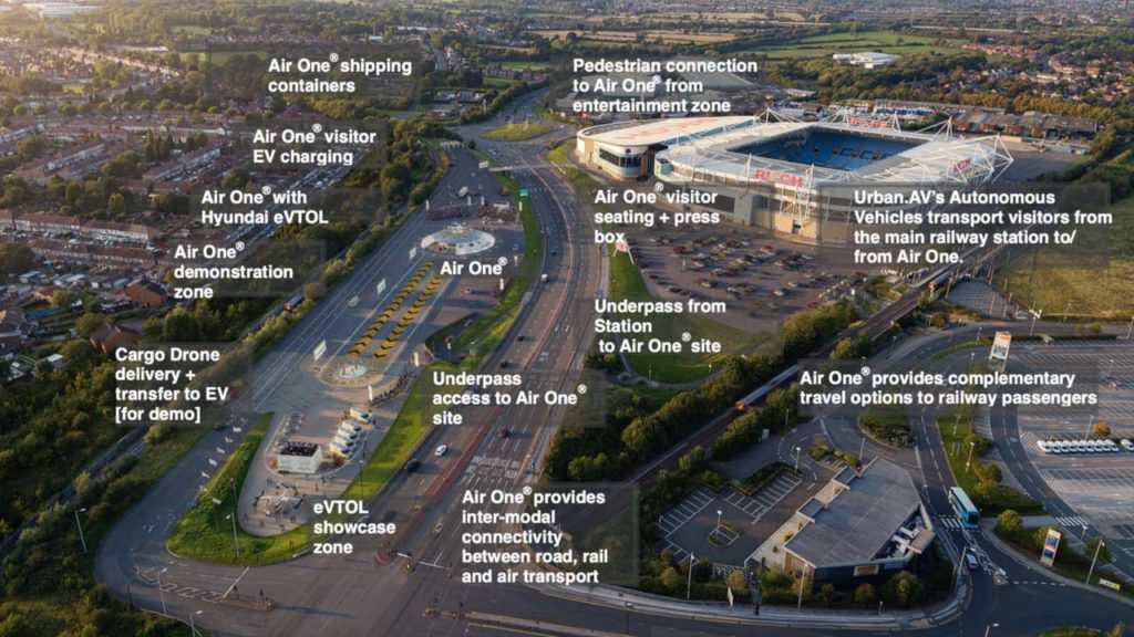 Urban Air Port claims the planned Coventry hub to be the world’s smallest airport. Besides passenger air taxi and autonomous logistics services, the hub will also have demonstration and showcase zones as depicted in the rendering above. The Air-One is expected to be ready for the 2022 Commonwealth Games.