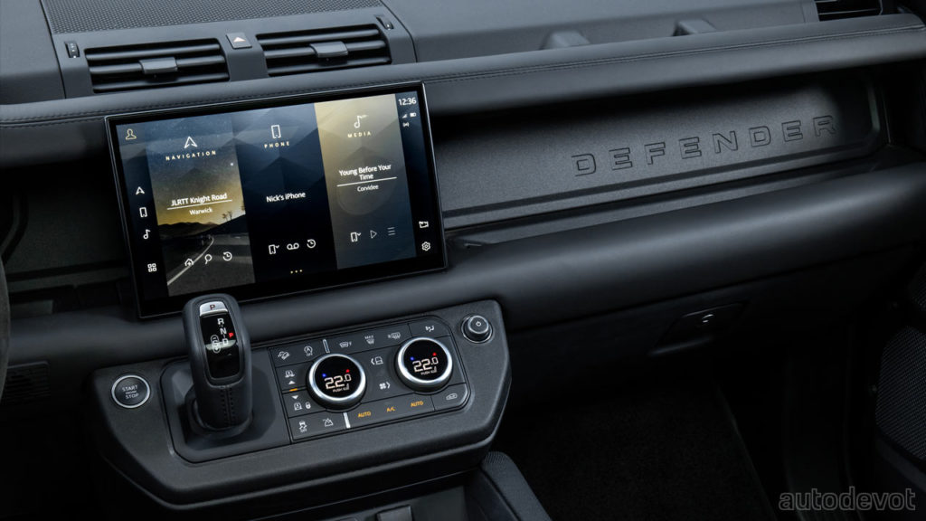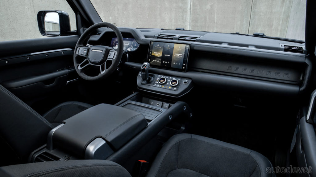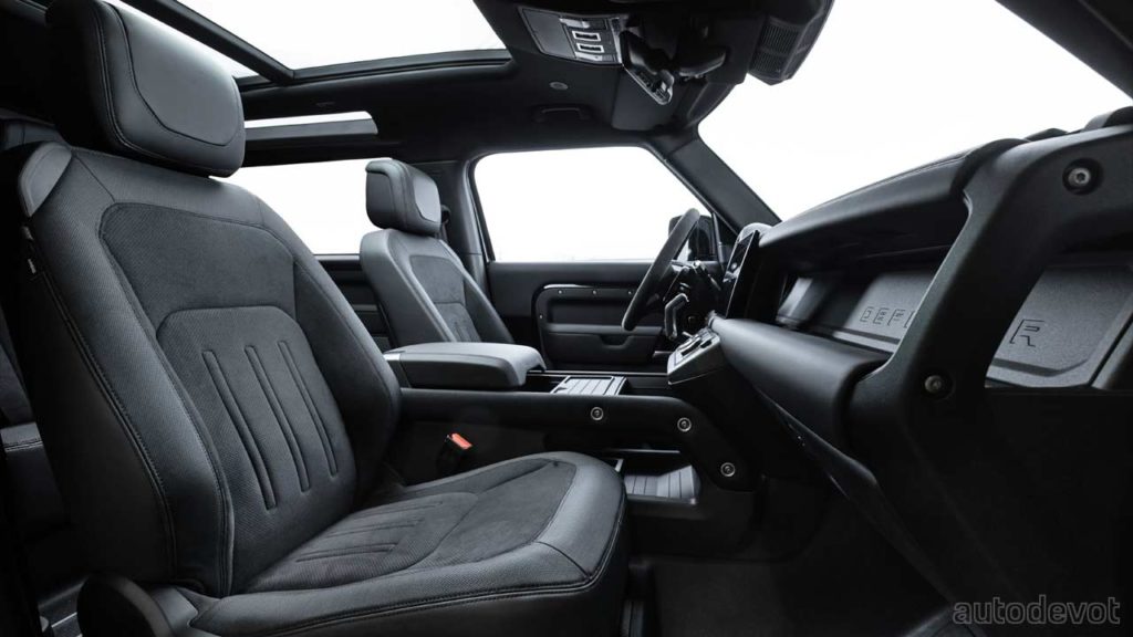 Inside, the Defender V8 features seats trimmed in unique Ebony Windsor leather with Miko Suedecloth and Robustec accents; Cross Car Beam in a special Satin Black finish; steering wheel with an Alcantara rim and satin chrome gearshift paddles; and illuminated treadplates with a V8 script. Buyers can go for the larger, optional 11.4-inch Pivi Pro central touchscreen.