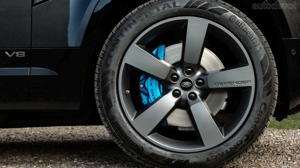 The exterior of the regular Defender V8 models features some enhancements compared to the non-V8 models, such as quad exhausts with distinctive tailpipes and unique 22-inch alloy wheels with a Satin Dark Grey finish. Another distinguishing factor is Xenon Blue calipers gripping 20-inch discs.