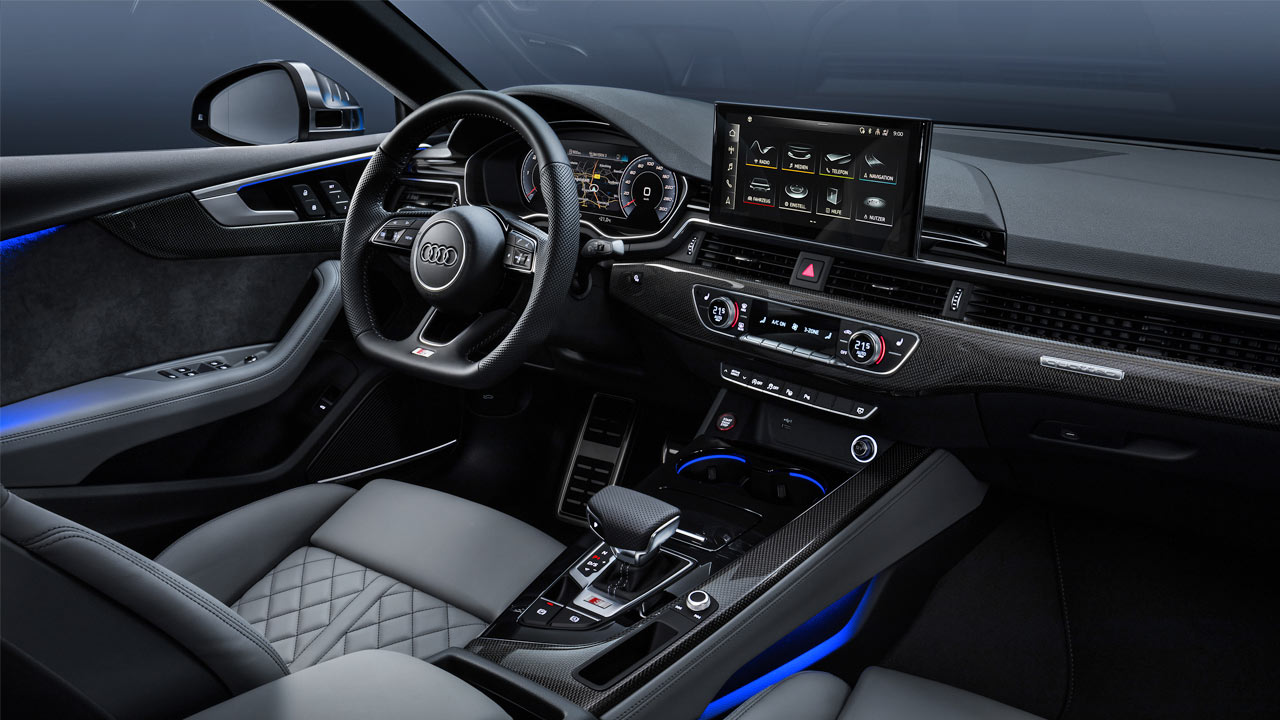 Features in the cabin include Audi Virtual Cockpit Plus, MMI Navigation Plus (central touchscreen), front Sport seats, Alcantara-leather combo upholstery, and safety systems such as airbags and TPMS. Head-Up Display, B&O sound system, Audi Park Assist, and S sports suspension with damper control are part of the options list. Download the brochure here.