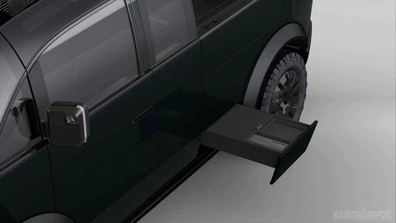 The pickup truck truly is modular with its extendable front worktable with power outlets; flip-down side tables; bed that can extend from 6-ft to 8-ft long; dividers in the bed to properly organize stuff and keep them secure; and a sidestep that doubles as another hidden storage space. Also, the truck can accommodate a variety of camper shells for different use cases.