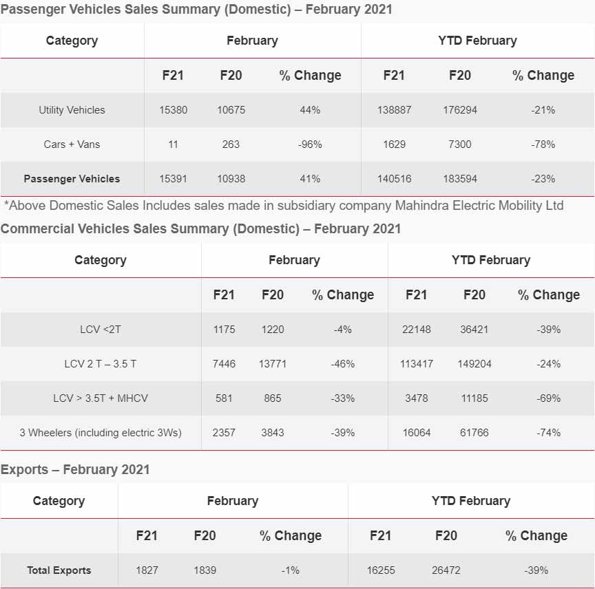 Mahindra & Mahindra Ltd. (M&M) sold a total of 28,777 vehicles (domestic + exports) in February 2021, registering a decline of nearly 11.4% compared to 32,476 vehicles sold in February 2020. However, in the PV segment, the company sold 15,391 vehicles last month in the domestic market, a growth of nearly 41% compared to 10,938 vehicles sold in the same month a year ago.