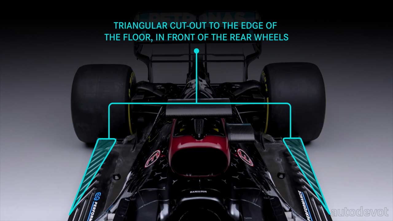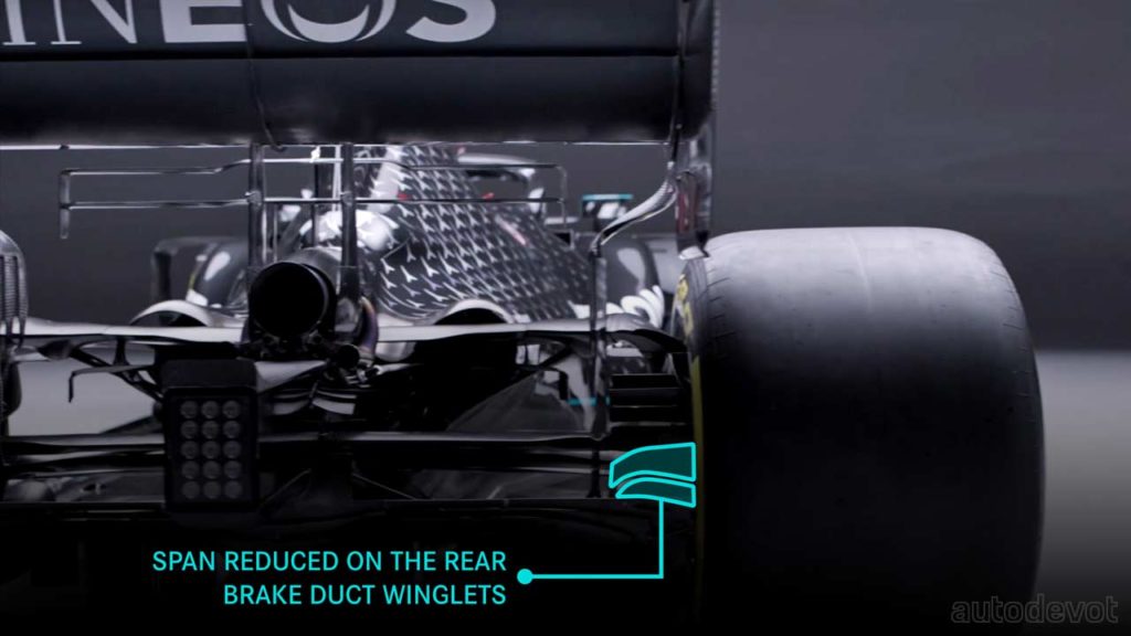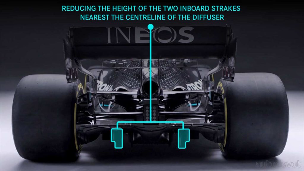 Aero improvements include a triangular cut-out on the edge of the floor, in front of the rear wheels; reducing the span of the rear brake duct winglets by a few centimetres; reducing the height of the two inboard strakes close to the centreline in the diffuser, and sealing up the slots in the floor around the bargeboards.