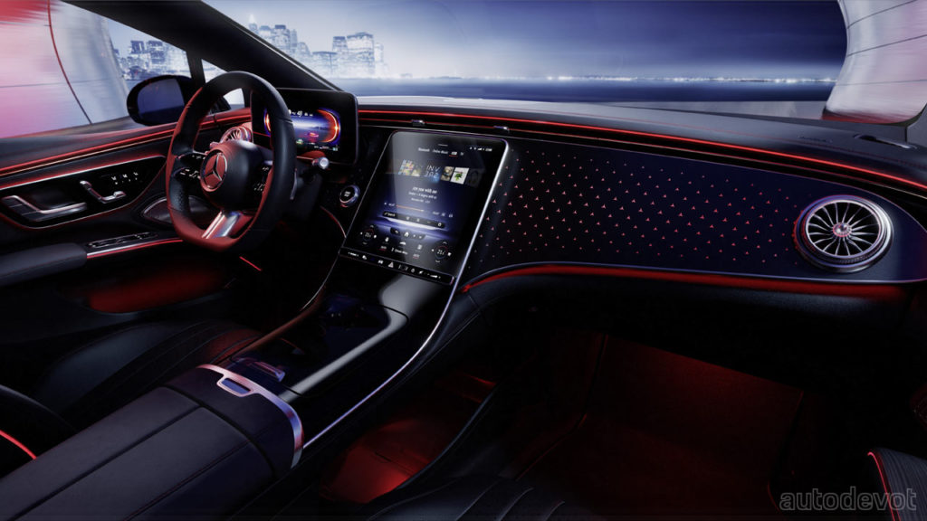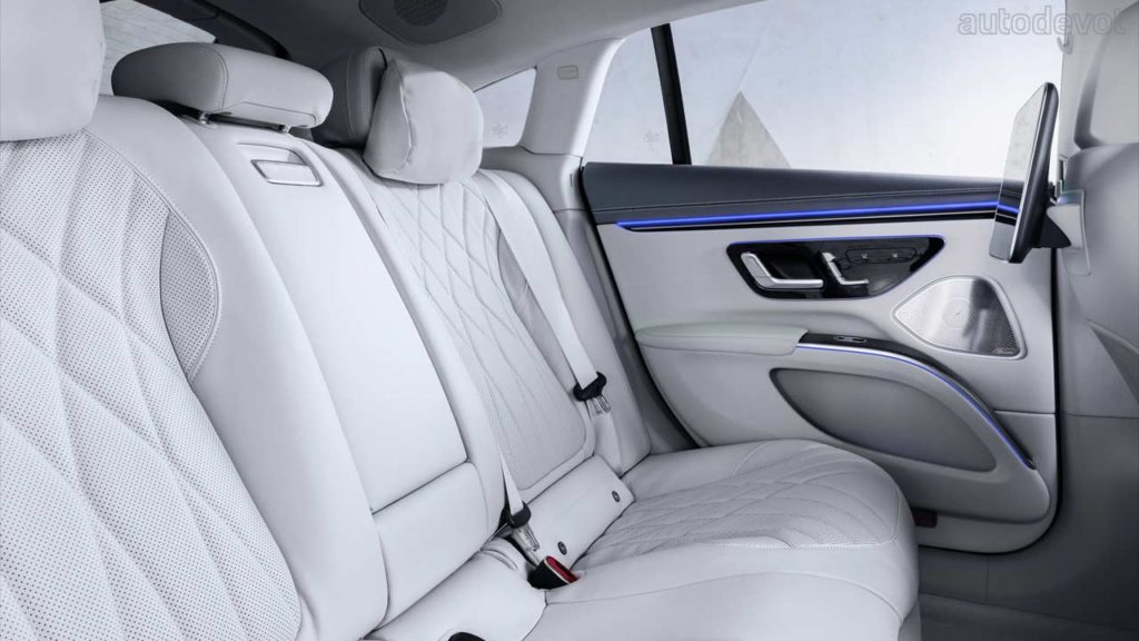 Speaking of which, the EQS cabin looks even more futuristic compared to that of the S-Class. The dashboard is dominated by the MBUX Hyperscreen we saw earlier this year, which is powered by an 8-core CPU and 24 GB RAM. There are a total of 12 actuators beneath the touchscreen for haptic feedback, and up to 7 profiles can be stored in the system. Also, the “Hey Mercedes” command supports up to 27 languages with Natural Language Understanding (NLU). The curved glass panel is coated with aluminium silicate for scratch-resistance.