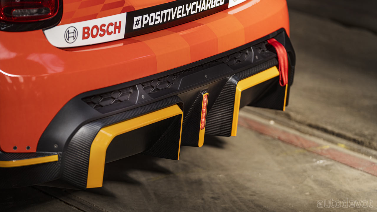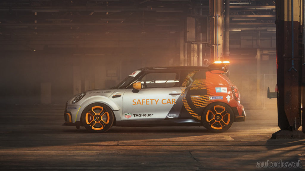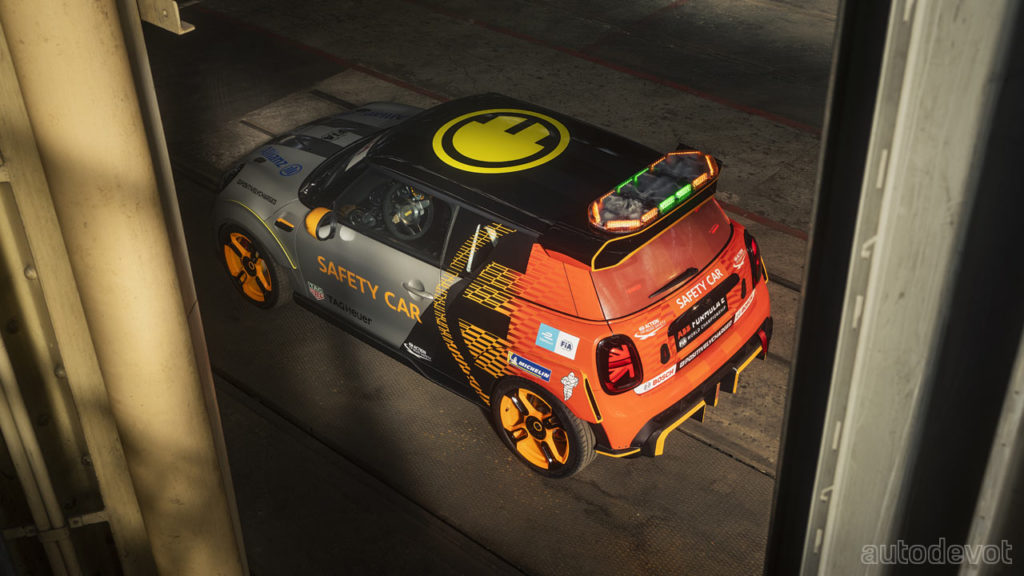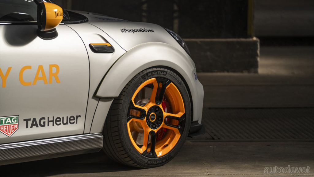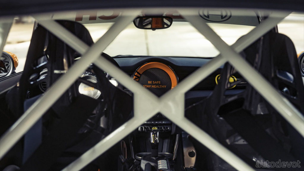 As you can imagine, the cabin has been stripped down to bare essentials; there are no rear seats, no central touchscreen. There’s a special seat for the driver with a six-point belt, which apparently is approved for both racing and road use; a minimalist steering wheel with carbon fibre impact absorber, and a digital instrument cluster. There’s plenty of carbon fibre usage as you can tell. In fact, the safety car weighs 1,230 kg (2,711.7 lbs), which is 130 kg (286.6 lbs) lighter than the Cooper SE.