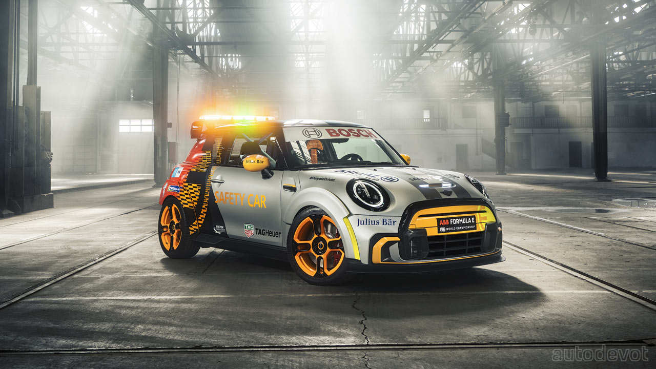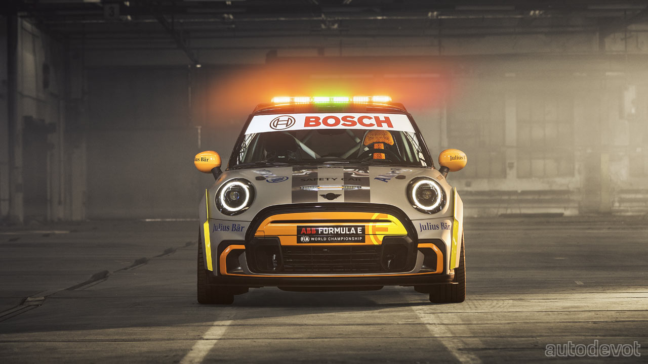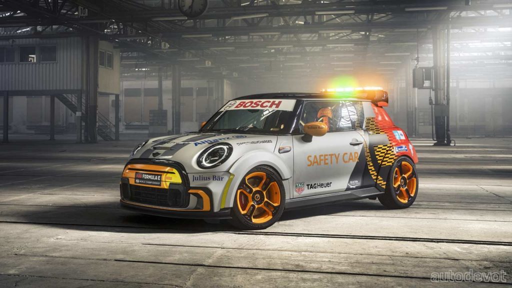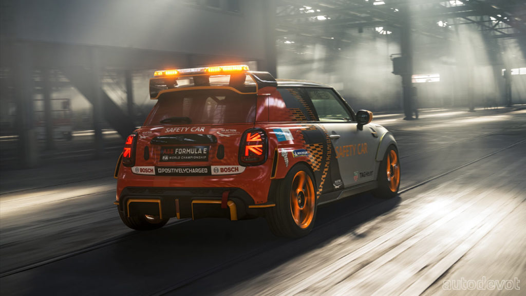 As you can imagine, the cabin has been stripped down to bare essentials; there are no rear seats, no central touchscreen. There’s a special seat for the driver with a six-point belt, which apparently is approved for both racing and road use; a minimalist steering wheel with carbon fibre impact absorber, and a digital instrument cluster. There’s plenty of carbon fibre usage as you can tell. In fact, the safety car weighs 1,230 kg (2,711.7 lbs), which is 130 kg (286.6 lbs) lighter than the Cooper SE.