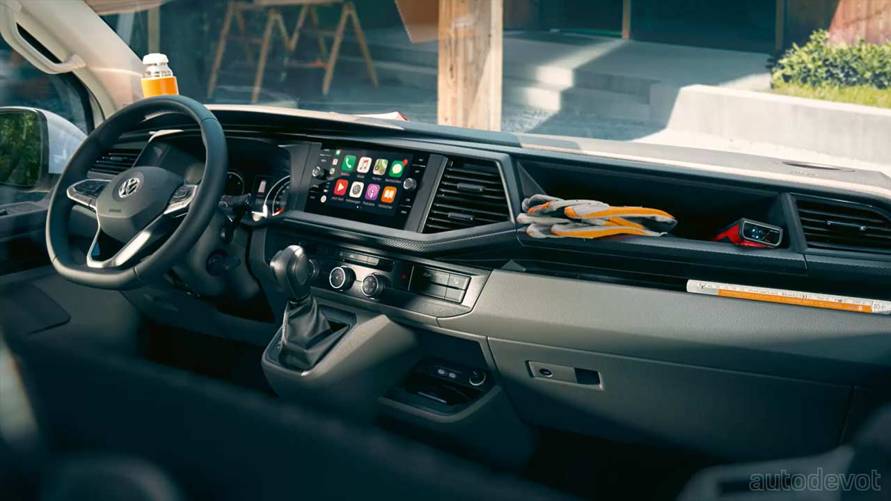 That’s right, the Transporter T6.1 Sportline commercial van will be available in short or long wheelbase versions, and as either a Kombi (cargo + people) or Panel Van (cargo only). The exterior of the vehicle can be finished in Indium Grey, Fortana Red, Ravenna Blue, or Copper Bronze colors. The van also gets a sporty front bumper, a red contrast grille strip, a rear spoiler, 18-inch alloy wheels in gloss black, and illuminated side bars. Rounding off the sporty looks is a 30 mm lowered suspension. Options include Eibach coilover suspension.