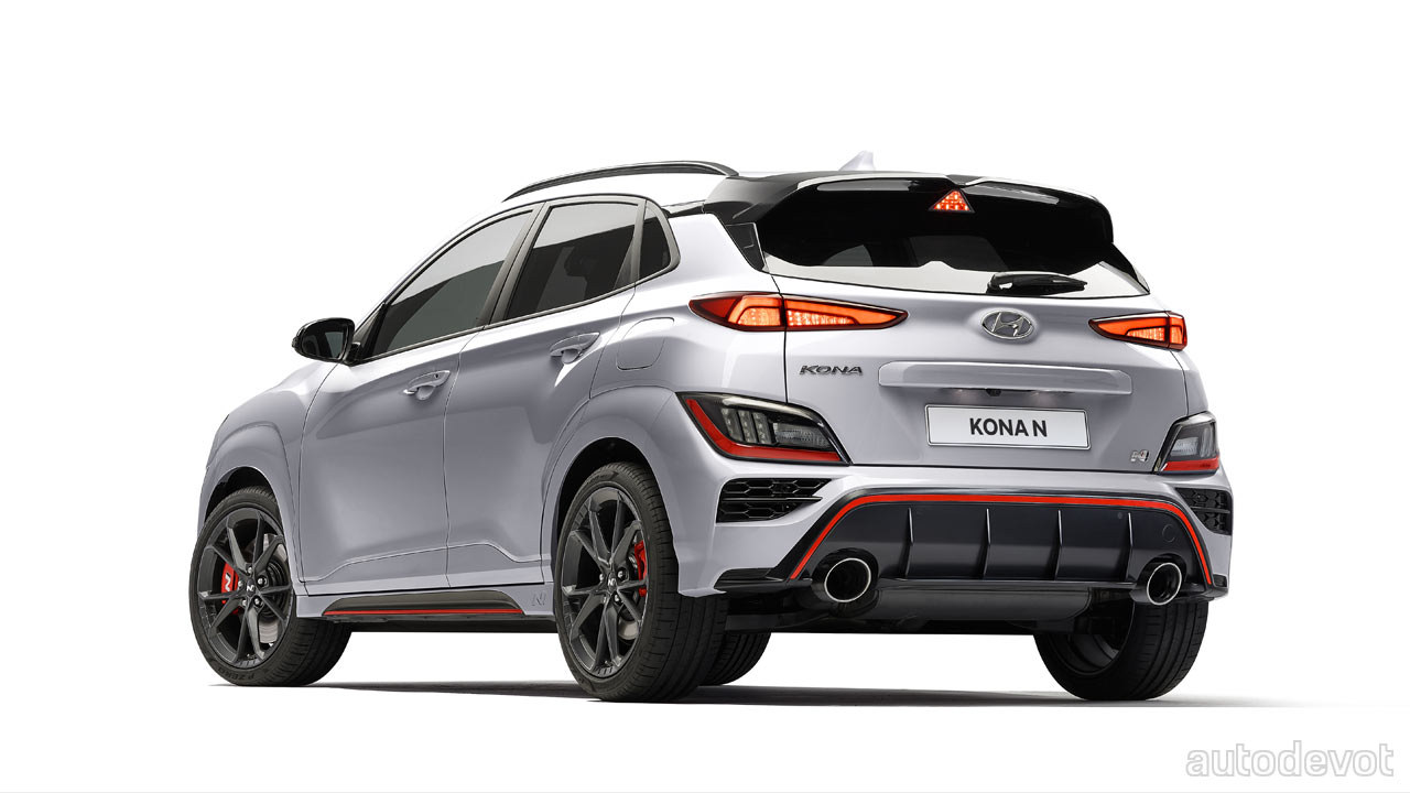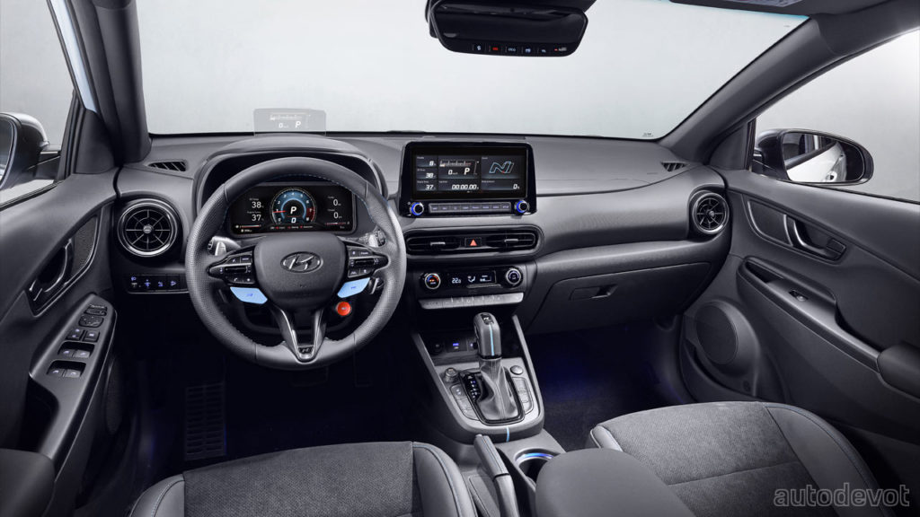 The Kona N will be available in 7 exterior colors: Sonic Blue with Tomato Red accents (launch color), Phantom Black Pearl, Atlas White, Cyber Grey Metallic, Dark Knight Grey Pearl, Ignite Red, and Performance Blue.