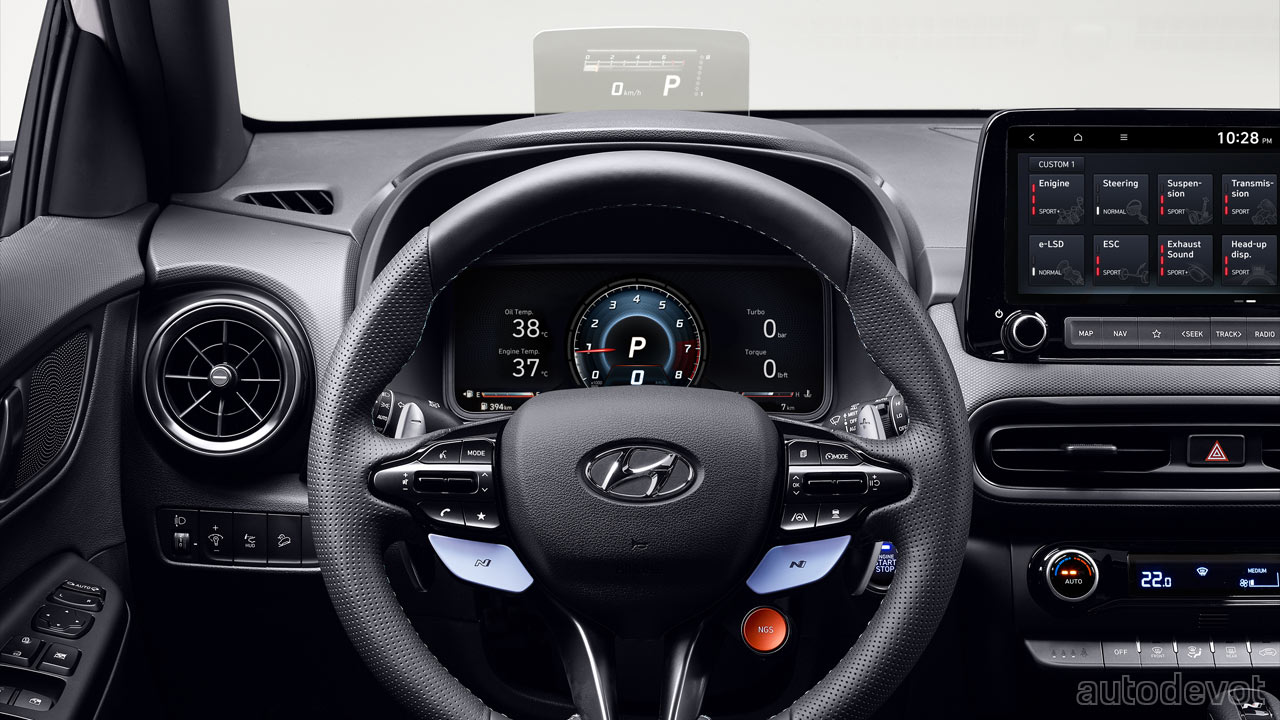 The black-themed cabin features subtle blue accents and contrast stitching. The sports seats with pronounced side bolsters are claimed to offer excellent lateral support; Hyundai will offer cloth, leather or suede upholstery options. Heating function comes standard for front seats and is optional for the rear seats. Suede front seats come standard with ventilation. Also, the Kona N is the first high-performance Hyundai to be equipped with a Performance Head-Up Display (HUD). When turned on in Sport or N mode, it shows RPM, speed, and shift indicator.