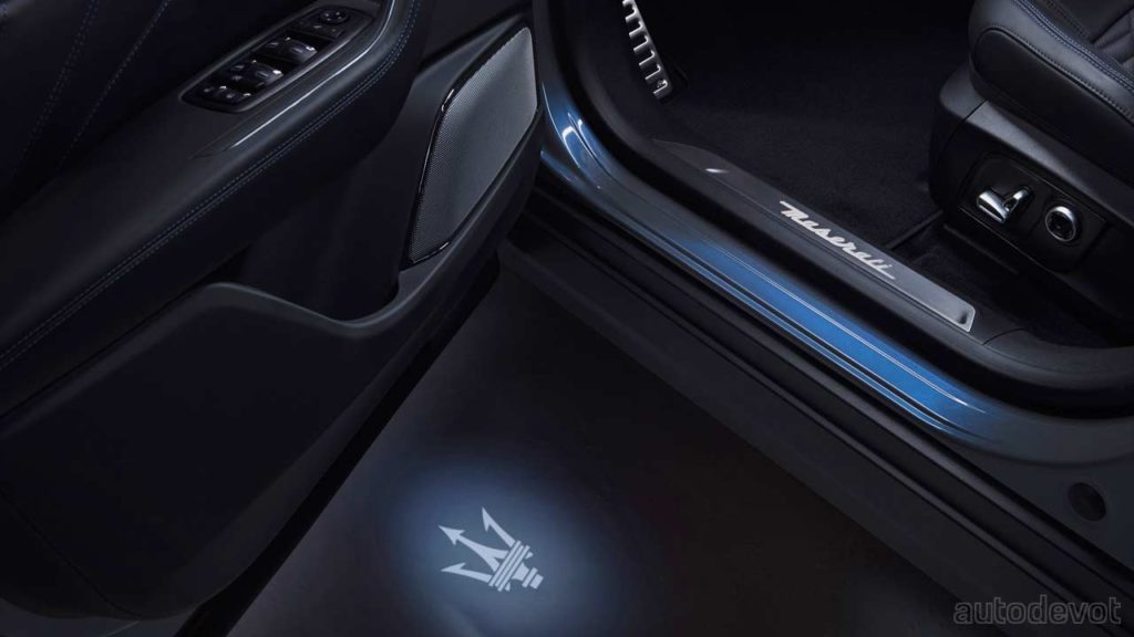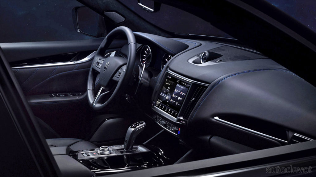 The cabin features blue contrast stitching to remind the occupants that they’re driving an electrified Maserati. The rest of the features would include all the usual stuff, such as an 8.4-inch central touchscreen (powered by Android OS), Maserati Connect connected car technology, Air Quality Sensor, Highway Driving Assist and so on. Options include 4-zone climate control, and Harman Kardon or Bowers & Wilkins audio systems.
