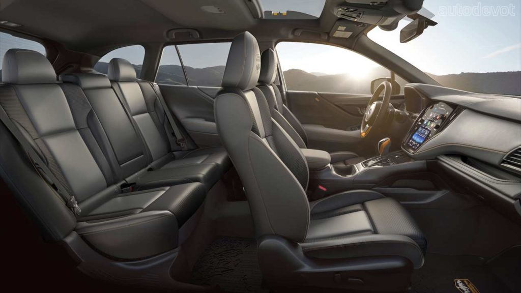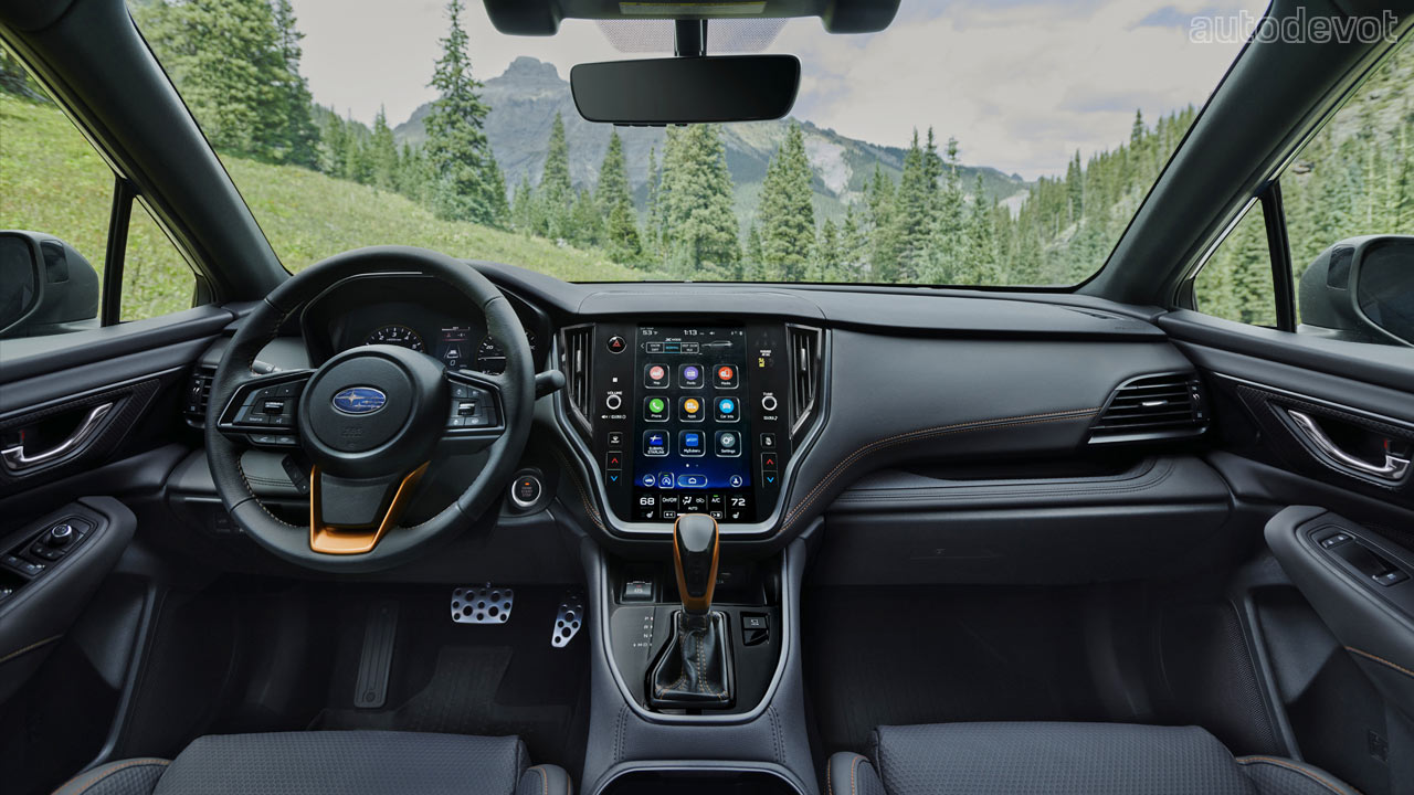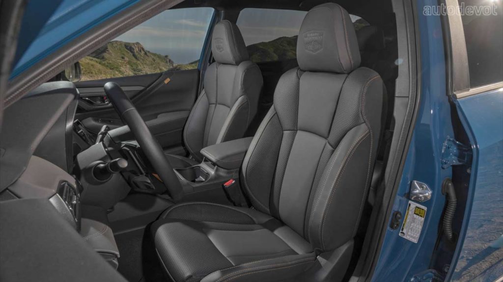 In the cabin, the seats are wrapped with StarTex water-repellant material that includes the Subaru Wilderness logo embossed onto the headrests. Other touches include copper-colored contrast stitching, copper-finish accents, brushed aluminum pedals, and Gunmetal Grey for touchpoints such as air vent grilles and cupholders, replacing the chrome. In the cargo area, the rear seatback is wrapped in a waterproof material, and the cargo tray is waterproof as well — protecting the load floor. In addition, the Subaru Wilderness logo appears in the instrument cluster during vehicle start-up.