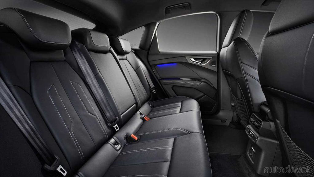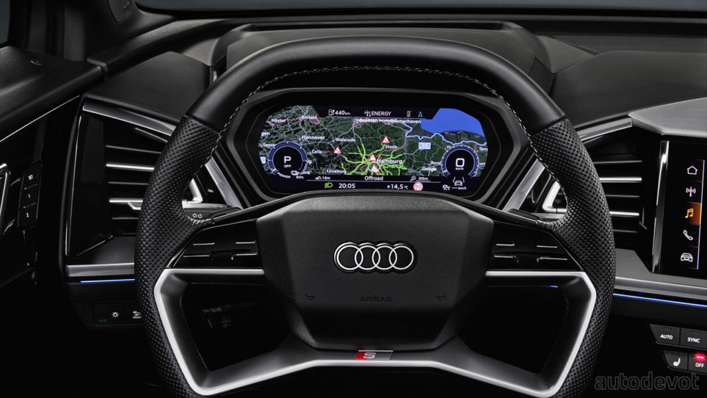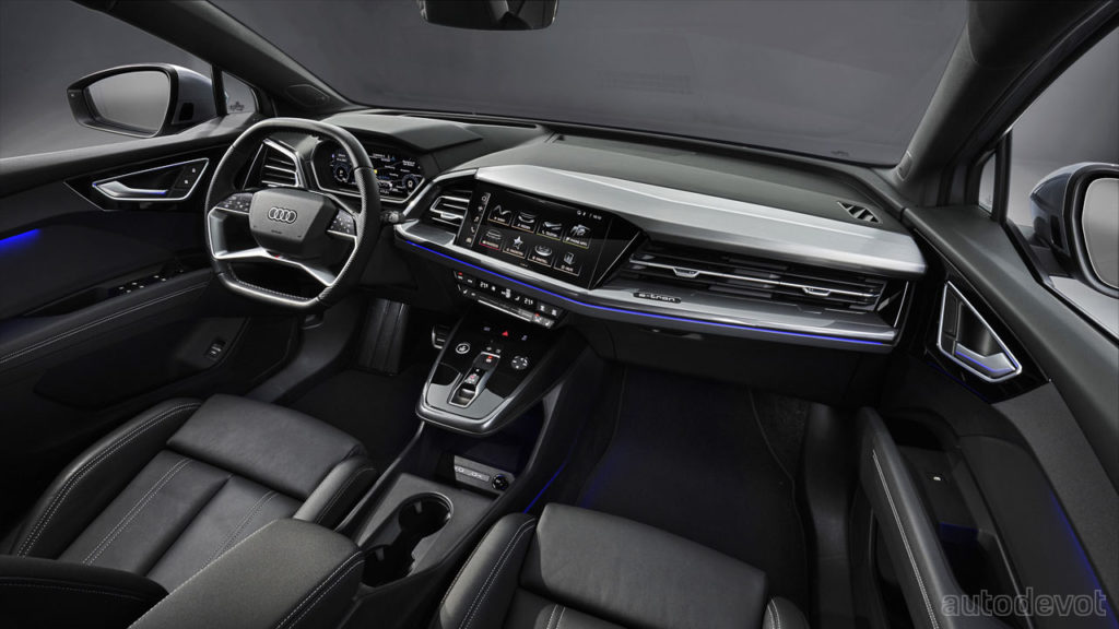 The production interior of the Q4 e-tron was revealed last month. You can check that out in detail here. Features list includes a 10.1-inch central touchscreen, a 10.25-inch digital driver display, and an Augmented Reality Head-Up Display. There are a couple more options for larger displays; the example showcased above features the Virtual Cockpit Plus. The options list also includes Sonos premium sound system.