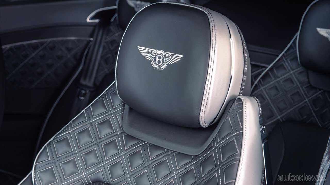 The cabin too has been matched with the exterior colors, such as silver accent hide complementing the Beluga main hide; silver contrast stitching on the seats and door cards; and dual finish veneers with Piano Moonbeam over Grand Black. The embroidered Bentley wings logo on the headrests is also in silver.