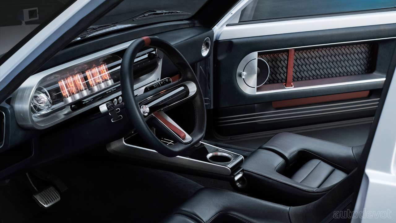 The chic cabin is also a mix of retro and modern bits. The feature list includes digital touch transmission, cradle space for a mobile phone and a voice-activated steering wheel. Not sure how any of those work, but there’s also the instrument cluster made of something which Hyundai calls “lighted vacuum tubes”. They’re actually the Nixie tubes with filaments in the shape of numbers that glow; Nixie tubes became obsolete in the ’70s. And, the trunk houses a stainless steel case.