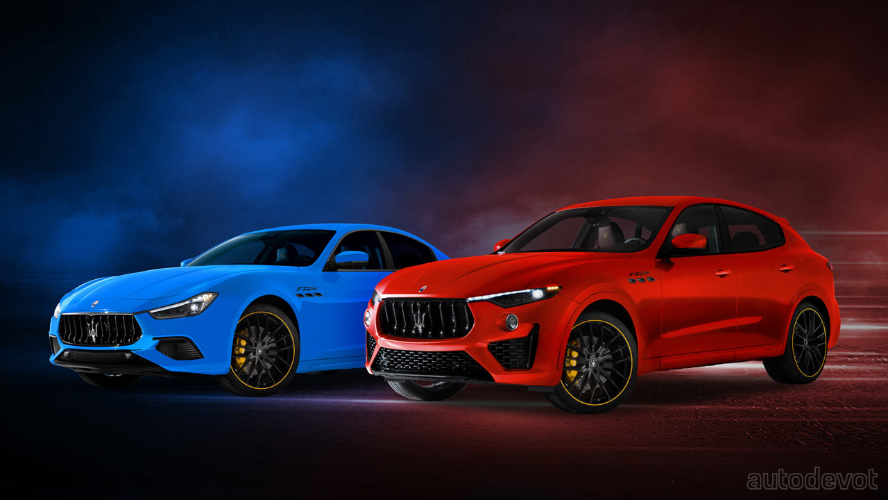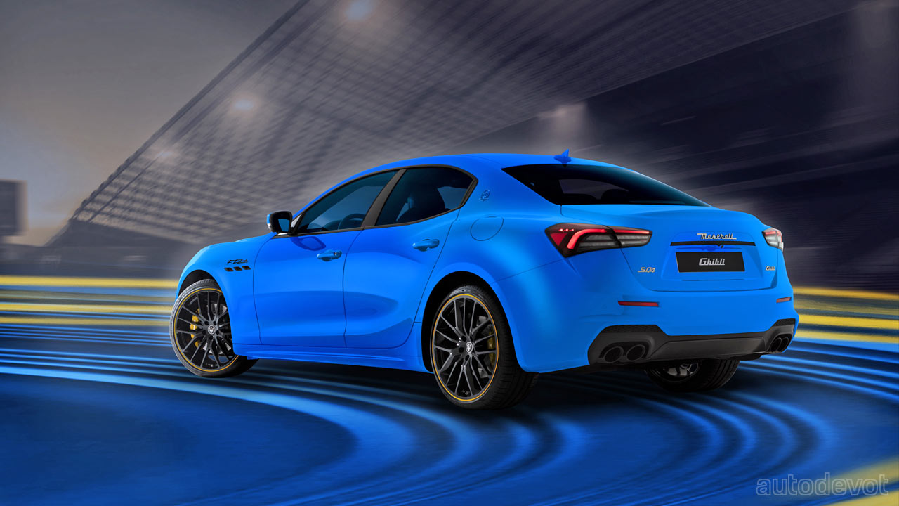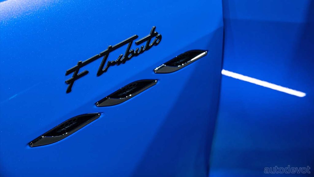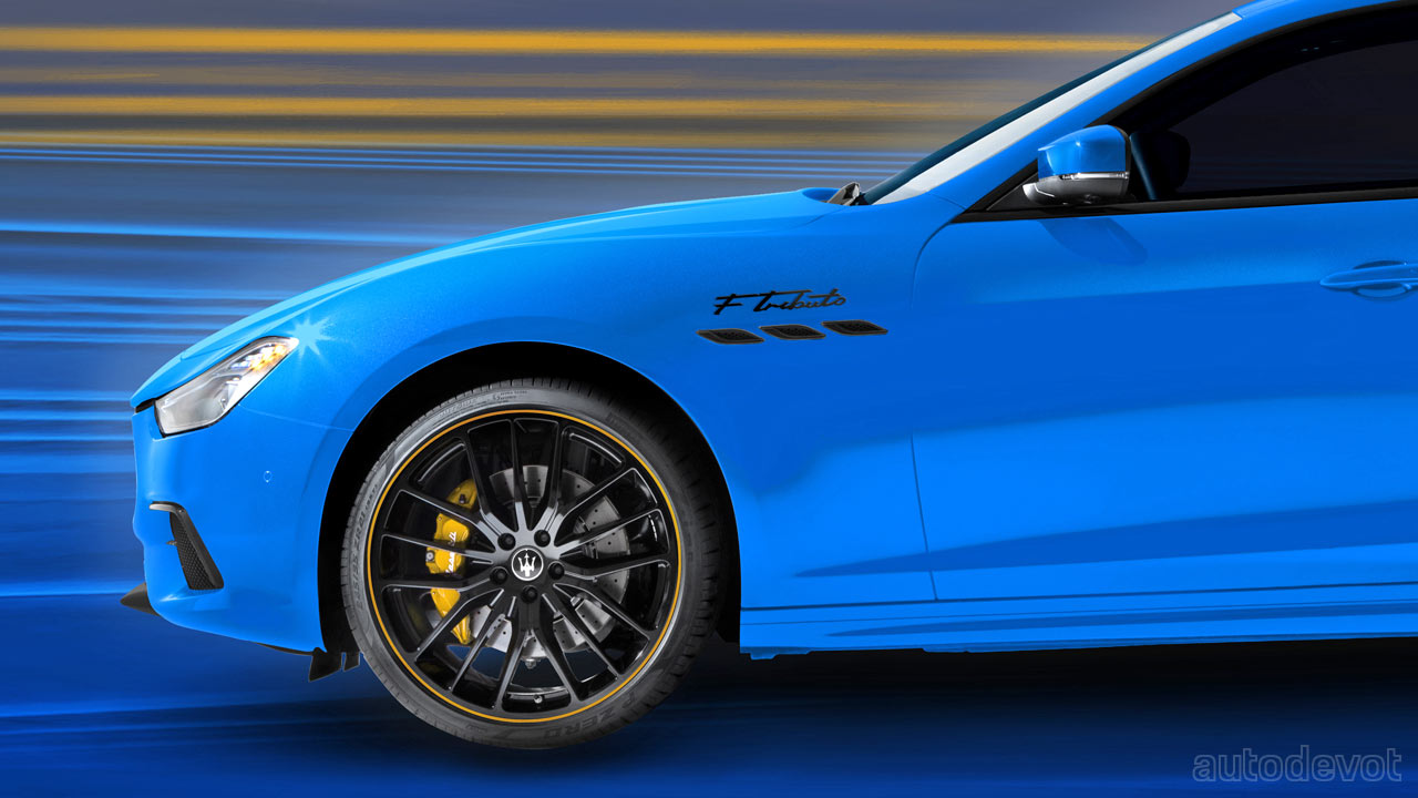 The Ghibli F Tributo special edition appears to be based on the Ghibli S Q4 (notice the rear badge on the Azzurro car), which offers 430 metric hp and 580 Nm (428 lb-ft) from a 3.0L twin-turbo V6 petrol engine. An 8-speed ZF automatic drives all four wheels. The 580 metric hp Ghibli Trofeo remains the range-topping model.