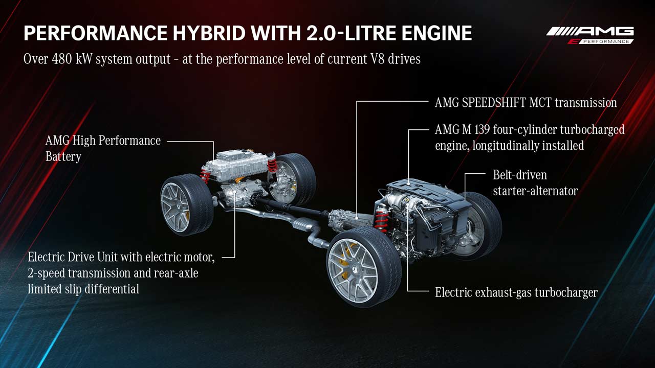 For hybrid performance offerings (in the future), Mercedes-AMG has revealed the E-Performance drivetrain, which as depicted in the infographics above, can be combined with either a 2.0L 4-cylinder turbo or a 4.0L V8 biturbo petrol engines. A permanently excited synchronous electric motor and a high-performance battery pack sits on the rear axle, offering up to (depending on the model) 150 kW (204 metric hp) and 320 Nm (236 lb-ft) torque. There’ll, of course, be 4Matic+ AWD system to transfer the drive power to the front wheels if needed.