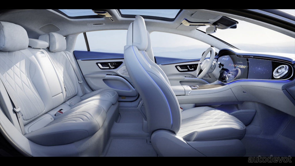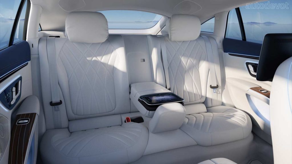 The EQS’ tech-overloaded cabin was revealed last month. More here. As we read about already, the cabin has been loaded with an overwhelming amount of technology and AI. Highlighlights include MBUX Hyperscreen with up to three displays on the dashboard; AI-based gesture controls, HEPA (High Efficiency Particulate Air) filter, 15-speaker Burmester surround sound system, and voice command support for up to 27 languages with Natural Language Understanding (NLU).
