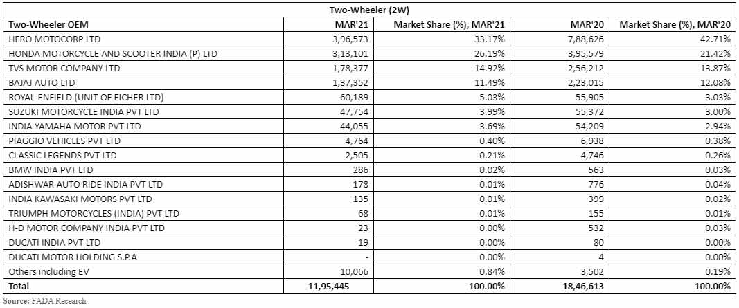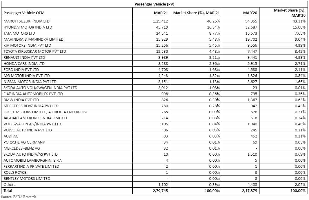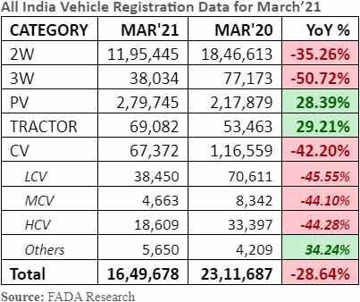 The Federation of Automobile Dealers Associations (FADA) has published March 2021 new vehicle registration data, which shows nearly 28.4% YoY growth in the Passenger Vehicles segment. The Tractor segment, in particular, continued double-digit growth. The overall registrations (including 2W, 3W, Tractor and CV), however, saw a decline of nearly 29% last month.
