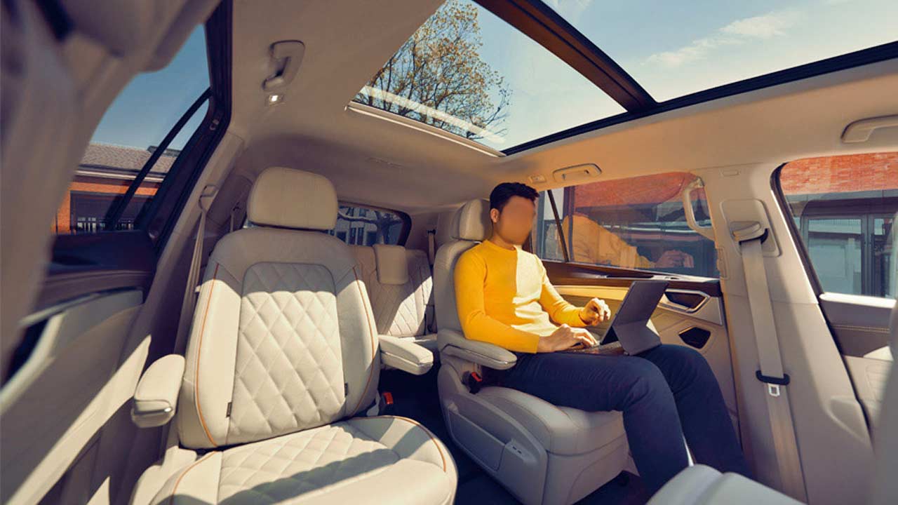 Inside, the dashboard looks rather busy with multiple tones and materials. The displays are housed in a stylishly deformed panel, which I think looks pretty cool. What I also like is the Talagon branding on that panel, just above the driver display. Obviously, the massive SUV offers generous space not just for people, but also to store other bits and pieces.