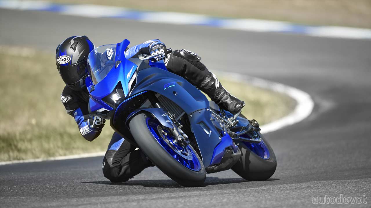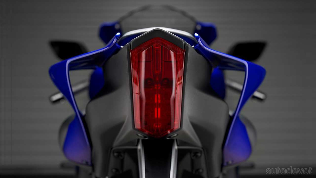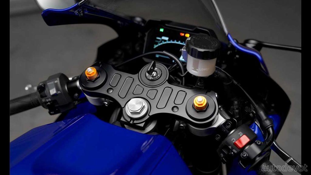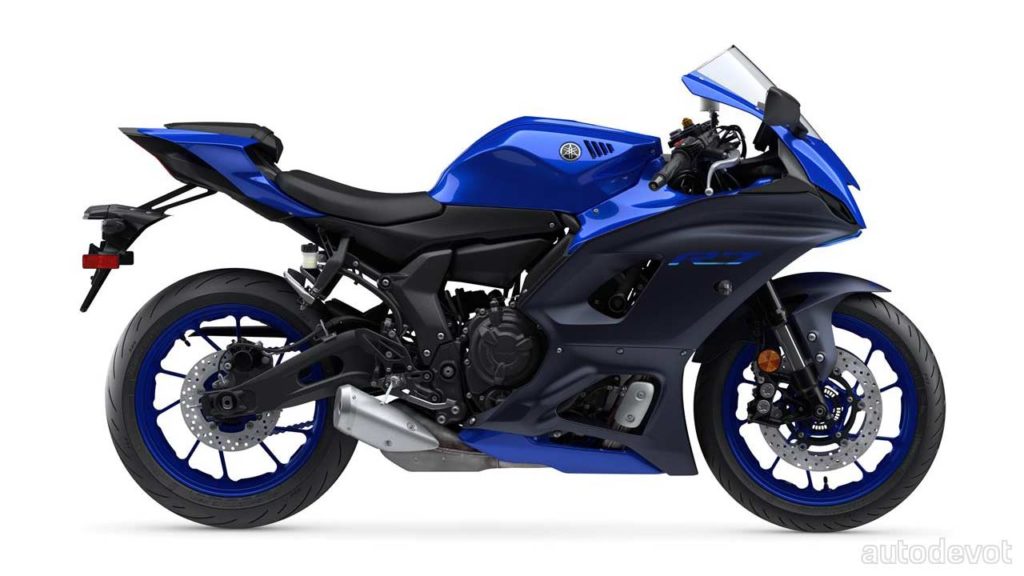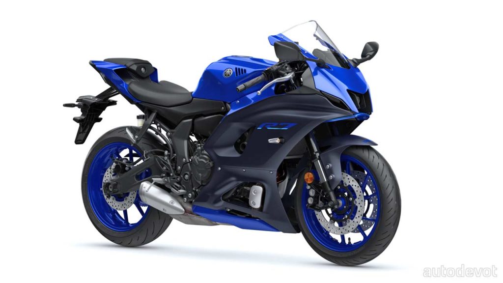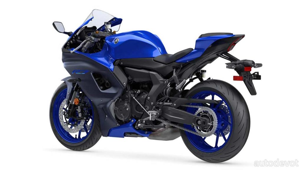 The new YZF-R7 has a slim body to cut through the air as efficiently as possible. The front fascia features a YZR-M1 MotoGP bike-inspired M-shaped air intake, flanked by small intakes with an integrated LED position light. A single LED headlight is recessed within the aforementioned M-shaped air intake. Buyers can choose between ‘Team Yamaha Blue’ and ‘Performance Black’ paint finishes.