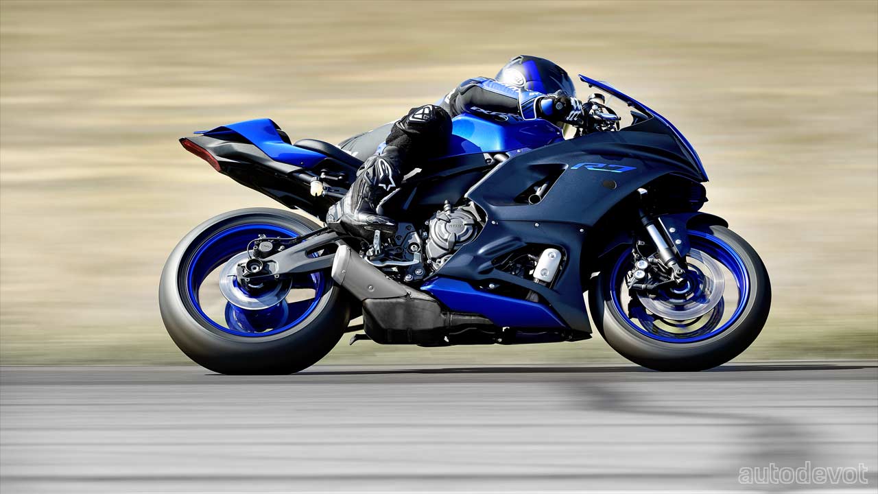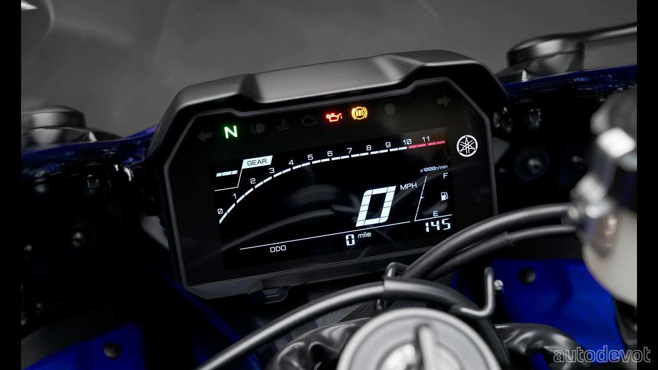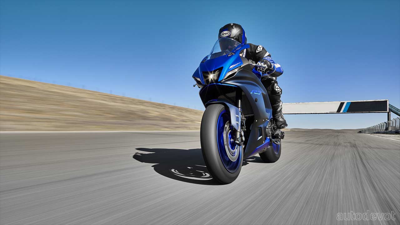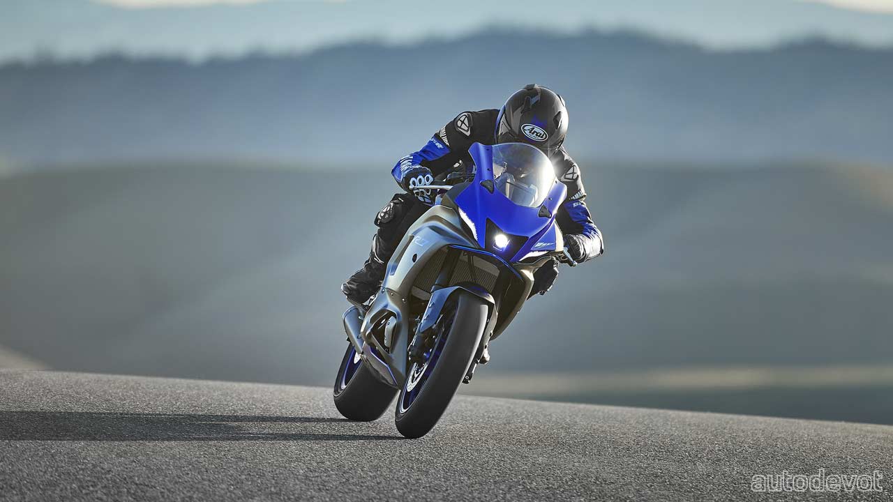 The new YZF-R7 has a slim body to cut through the air as efficiently as possible. The front fascia features a YZR-M1 MotoGP bike-inspired M-shaped air intake, flanked by small intakes with an integrated LED position light. A single LED headlight is recessed within the aforementioned M-shaped air intake. Buyers can choose between ‘Team Yamaha Blue’ and ‘Performance Black’ paint finishes.
