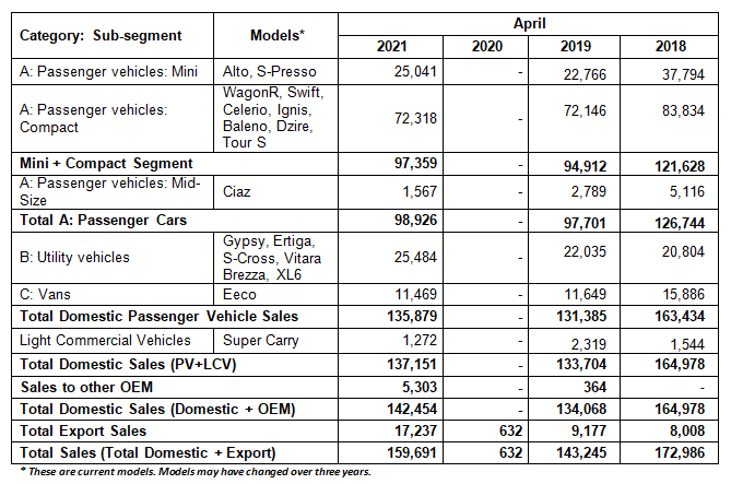 The ‘Compact’ segment with WagonR, Swift and Baleno accounted for 72,318 units, followed by the UV segment with Vitara Brezza and Ertiga accounting for 25,484 units last month. The ‘Mini’ segment with Alto and S-Presso settled for 25,041 units in April 2021.