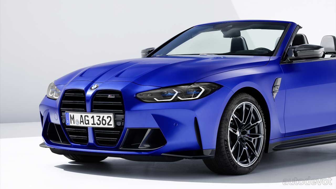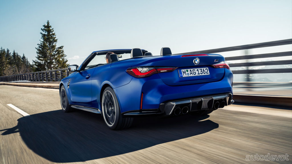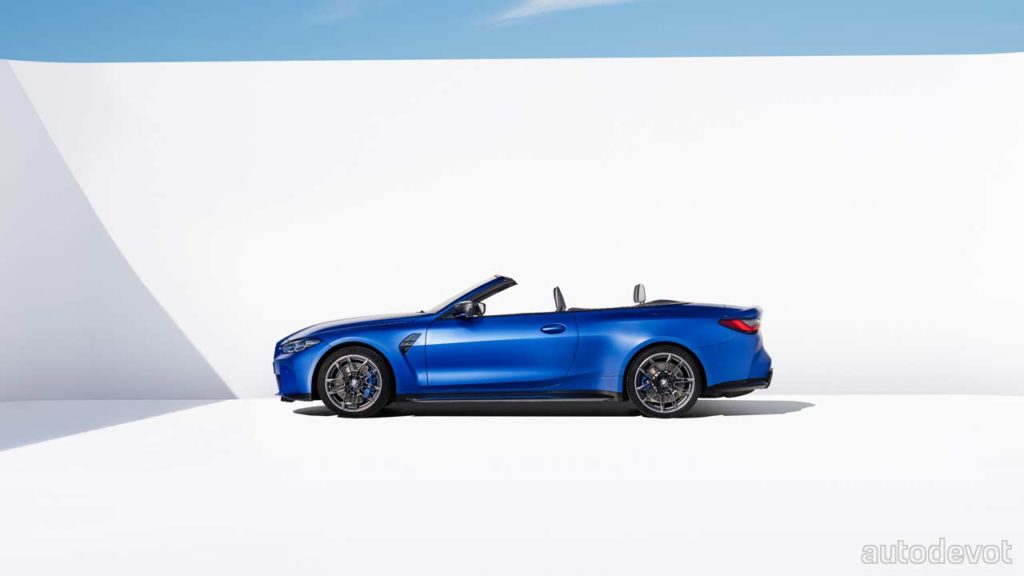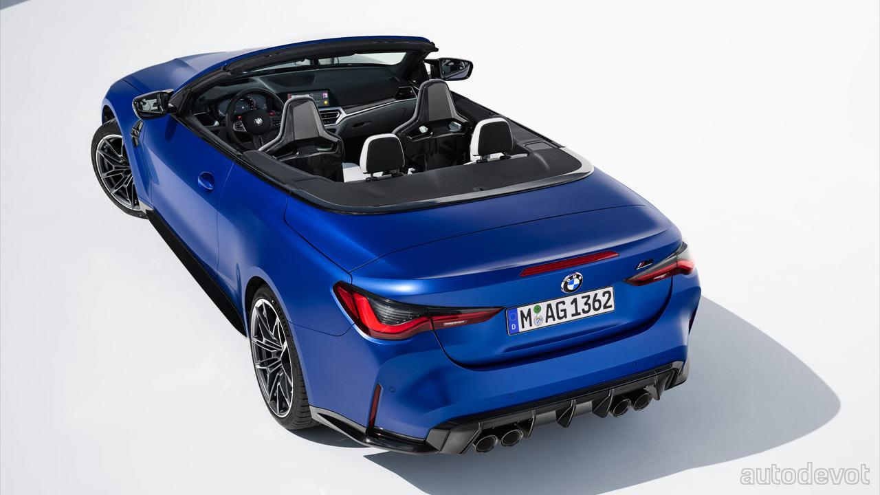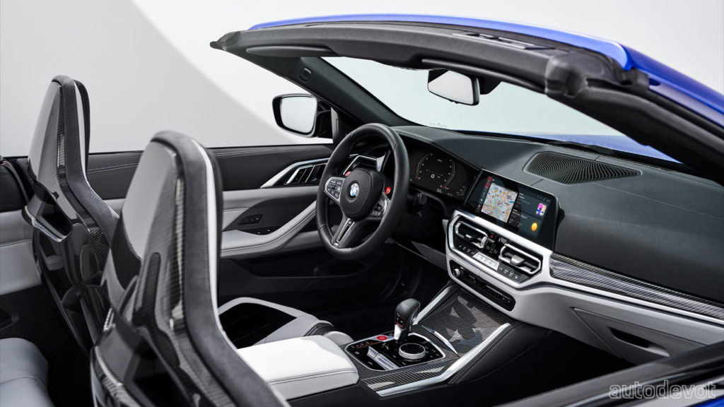 Also, to compensate for being a Convertible, the chassis has been enhanced with bracing elements to increase the longitudinal and torsional stiffness of the body structure. More details here. As a result, the Convertible weighs 145 kg (320 lbs) (unladen) more compared to the M4 Competition Coupe M xDrive (1,920 kg vs 1,775 kg/4,233 lbs vs 3,913 lbs). However, the M Race Track Package can cut down the weight by 25 kg (55 lbs), thanks to M Carbon ceramic brakes, even lighter M light-alloy wheels, M Carbon front bucket seats, and a few more carbon fibre interior bits. As standard, the car rides on forged M light-alloy wheels measuring 19-inch at the front and 20-inch at the rear.