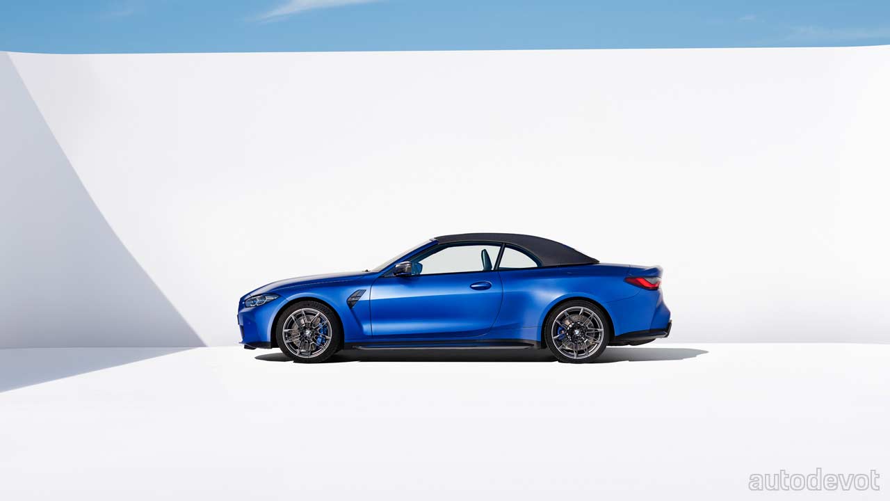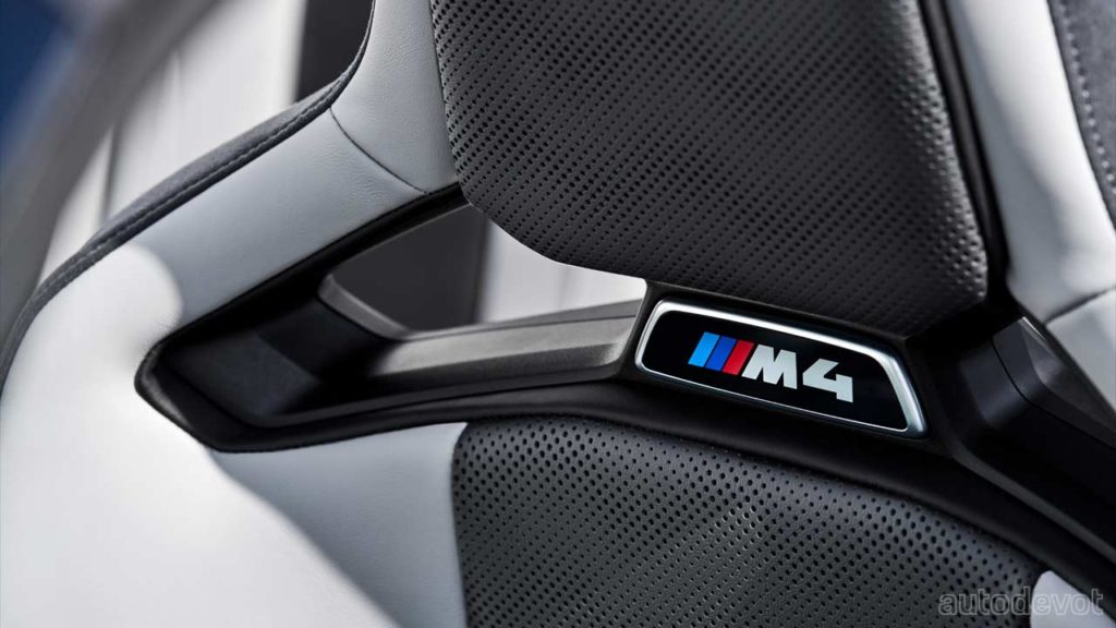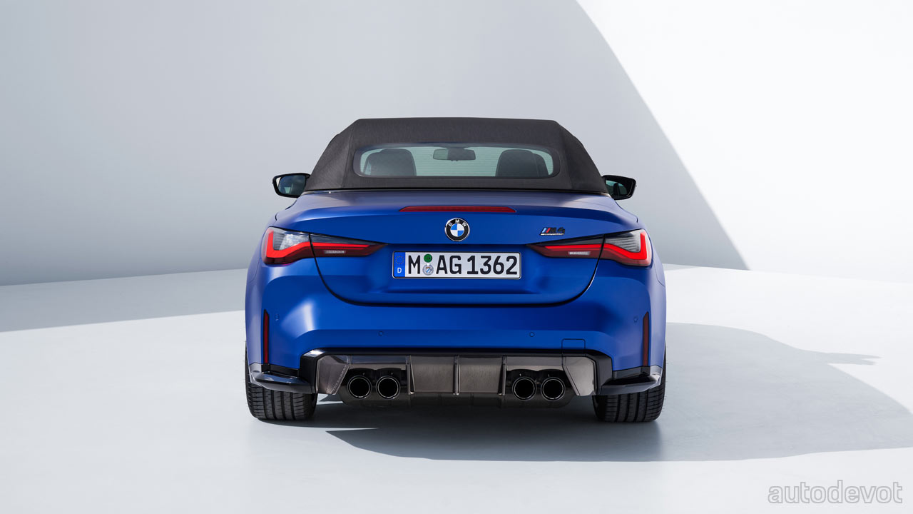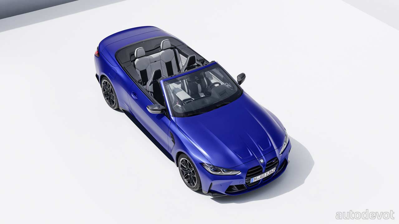Also, to compensate for being a Convertible, the chassis has been enhanced with bracing elements to increase the longitudinal and torsional stiffness of the body structure. More details here. As a result, the Convertible weighs 145 kg (320 lbs) (unladen) more compared to the M4 Competition Coupe M xDrive (1,920 kg vs 1,775 kg/4,233 lbs vs 3,913 lbs). However, the M Race Track Package can cut down the weight by 25 kg (55 lbs), thanks to M Carbon ceramic brakes, even lighter M light-alloy wheels, M Carbon front bucket seats, and a few more carbon fibre interior bits. As standard, the car rides on forged M light-alloy wheels measuring 19-inch at the front and 20-inch at the rear.