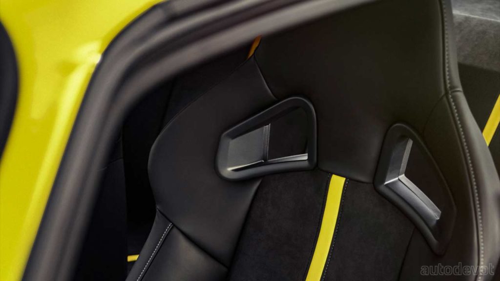 In the leather-Alcantara-covered cabin, the analog instruments have made way for a widescreen setup comprising 12- and 10-inch displays. The sport seats come from the Opel Adam S. There’s also a Bluetooth box from Marshall — a modern classic in a modern classic. The driver gets a Petri three-spoke leather-wrapped steering wheel with a 12 o’clock yellow marker. Tastefully applied yellow accents on the seats, door cards and on the dashboard add the necessary contrast to an otherwise dark cabin.