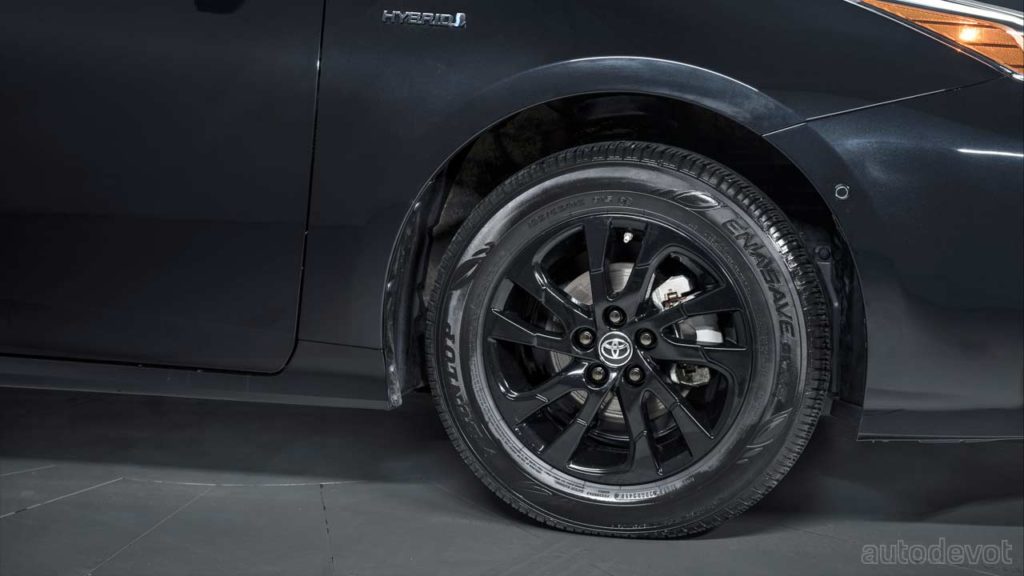 Mechanically, the Nightshade Edition remains the same. In America, the Prius is powered by a 1.8-litre (2ZR-FXE) 4-cylinder Atkinson cycle petrol engine combined with a permanent magnet electric motor at the front. The AWD-e models get an additional 5 kW (7 metric hp) induction motor at the rear. The combined system output on both models is 90 kW (122 metric hp). Transmission is an e-CVT.
