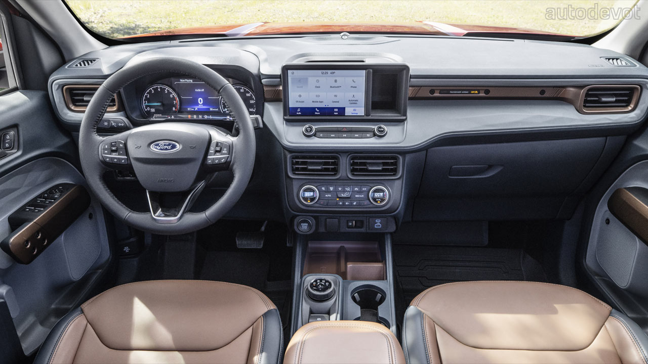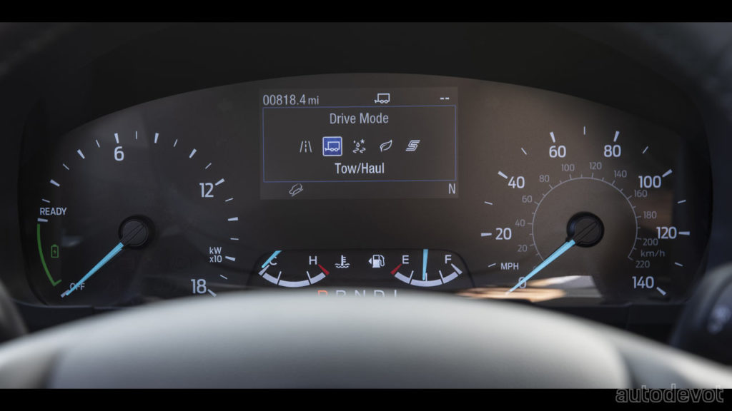 Moving on to the juicy bits of the story then, buyers get to choose between a hybrid powertrain and an EcoBoost. The Maverick Hybrid combines a 2.5-litre 4-cylinder Atkinson-cycle petrol engine and a permanent magnet electric motor. The ICE outputs 121 kW (165 metric hp) and 210 Nm (155 lb-ft) of torque, while the e-motor develops 94 kW (128 metric hp) and 235 Nm (173 lb-ft) of torque. The hybrid system output, however, is 142 kW (193 metric hp). An e-CVT drives the front wheels. Ford is targeting an EPA-estimated rating of 40 mpg city fuel economy, and 500 miles (805 km) of range on a single tank of gas.