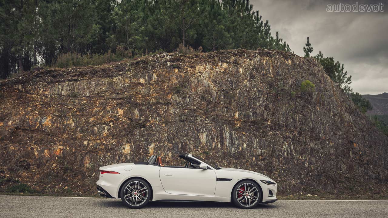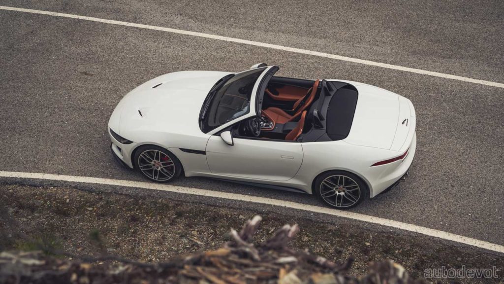 The supercharged V8 in the F-Type R pumps out 423 kW (575 metric hp) at 6,500 rpm and 700 Nm (516 lb-ft) of torque between 3,500-5,000 rpm. The official 0-60 mph (96.5 km/h) time for this one is 3.5 seconds and the top speed is 299 km/h (186 mph).