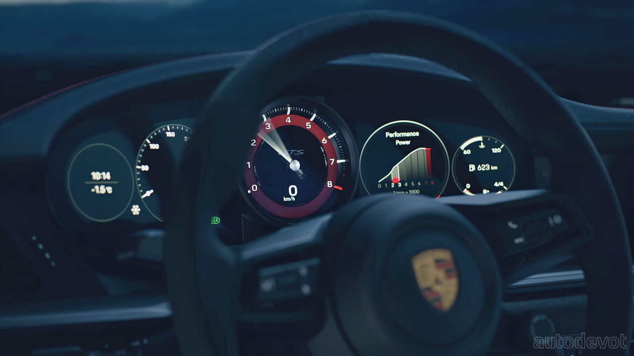 The 3.0-litre flat-six turbo develops 353 kW (480 metric hp) and a max torque of 570 Nm (420 lb-ft) — an increase of 30 metric hp and 40 Nm over the current Carrera S and an increase of 30 metric hp and 20 Nm over the previous Carrera GTS. The engine is paired with an 8-speed PDK as standard, but a 7-speed manual option is also available. A sports exhaust system is included as standard.