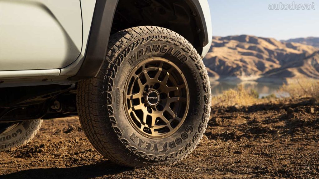 As for the visual stuff, there’s a new Lunar Rock paint option, complemented with heritage-inspired bronze-lettered grille and bronze-finished 16-inch wheels. The wheels are wrapped with new Goodyear all-terrain tires.