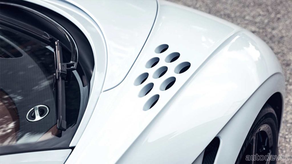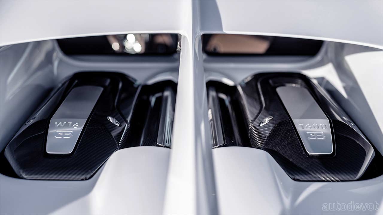 The engineers managed to shave 23 kg (51 lbs) off the car. That might not seem a lot, but we’ve to remember that the car has to carry a massive 8.0-litre W16 quad-turbo engine. Speaking of which, Bugatti said that the engine has been “thoroughly overhauled” (includes larger turbos) and it now revs up to 7,100 rpm — 300 rpm more. The power output is up by 74 kW (100 metric hp) to 1,176 kW (1,600 metric hp) — same as the 300+. A 1,600 Nm (1,180 lb-ft) of torque is available between 2,000 and 7,000 rpm. The 7-speed DCT can transition from 6th to 7th gear at 403 km/h (250 mph).