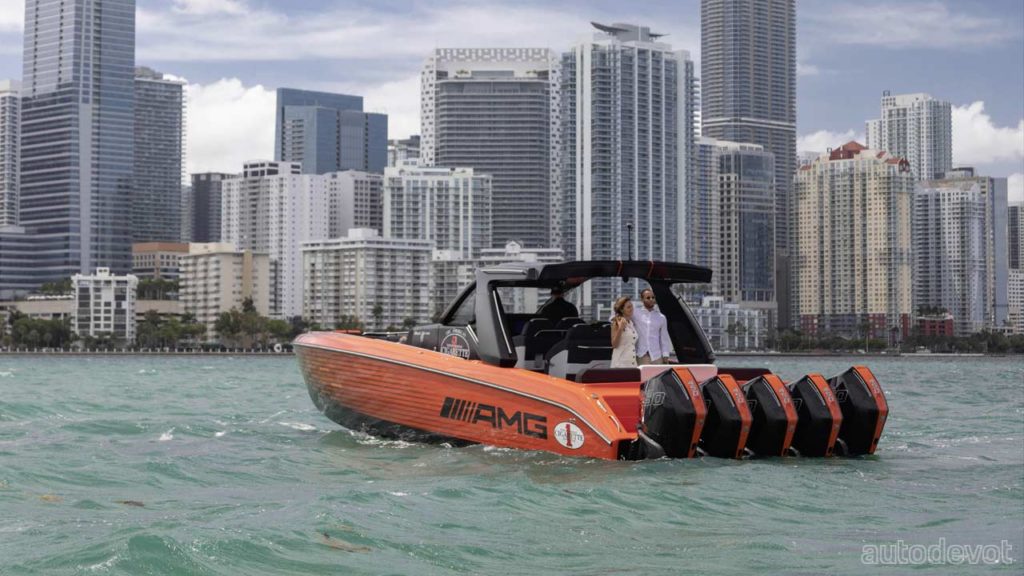 The 41’ Nighthawk AMG Edition is powered by five 4.6-litre V8 Mercury Racing 450R racing-grade engines that generate 450 peak propshaft horsepower each. The combined 2,250 hp output is claimed to accelerate the boat to a top speed of 90+ mph (145+ km/h).