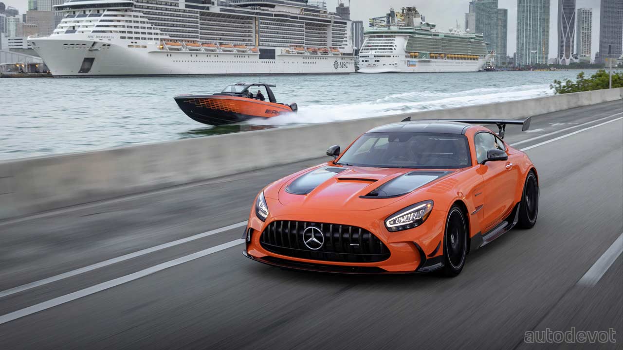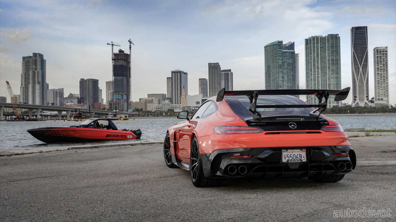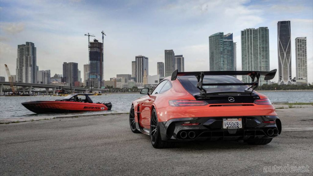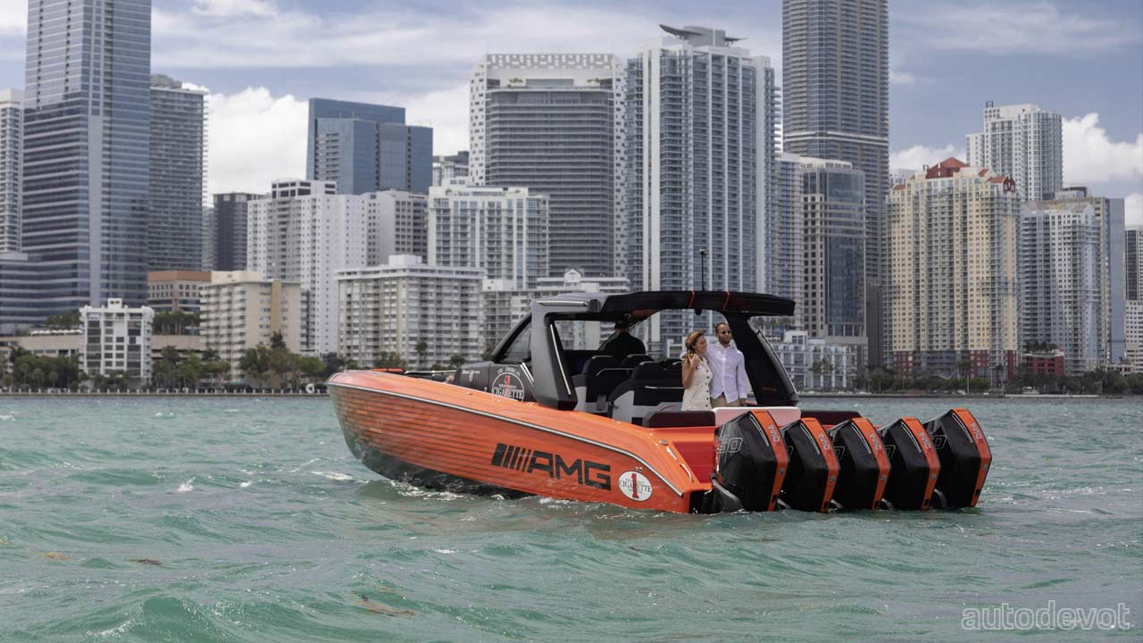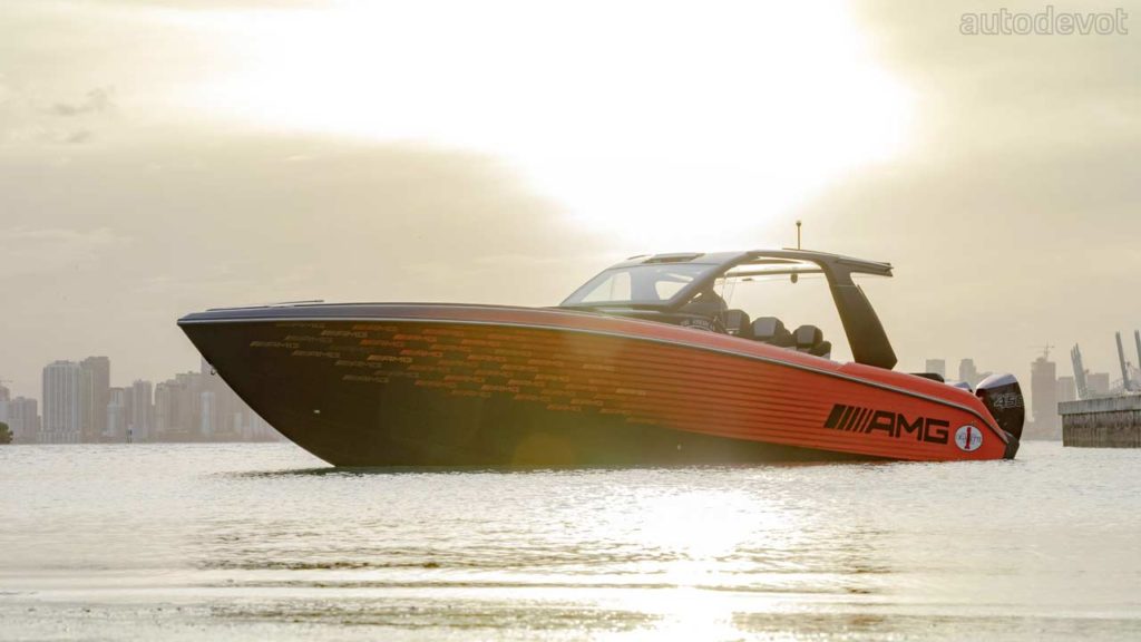 The yacht is drenched in Magmabeam orange — an exclusive, optional color offered on the GT Black Series. Complementing the orange are black highlights; in fact, there’s a pattern made of AMG logos on the hull.