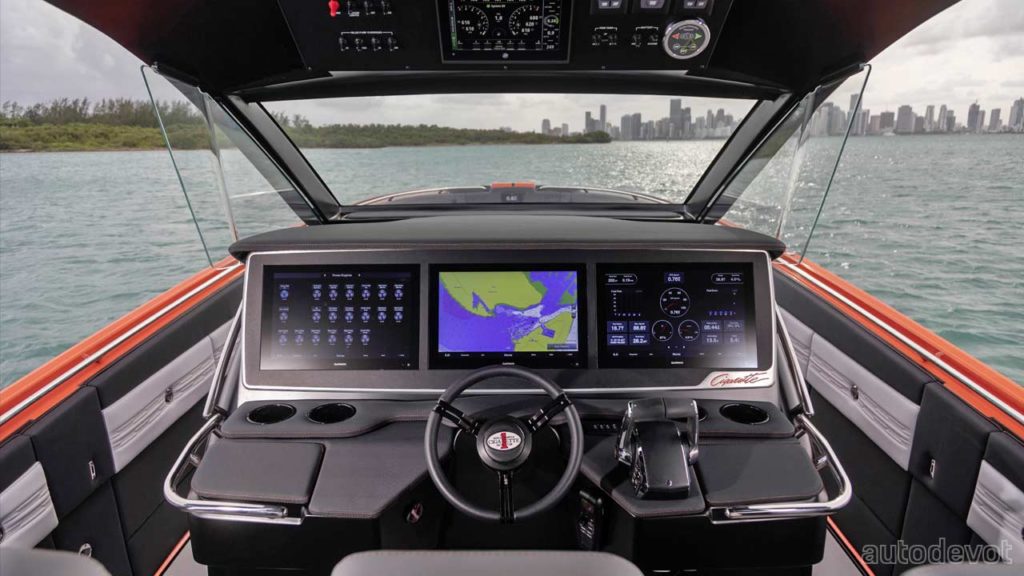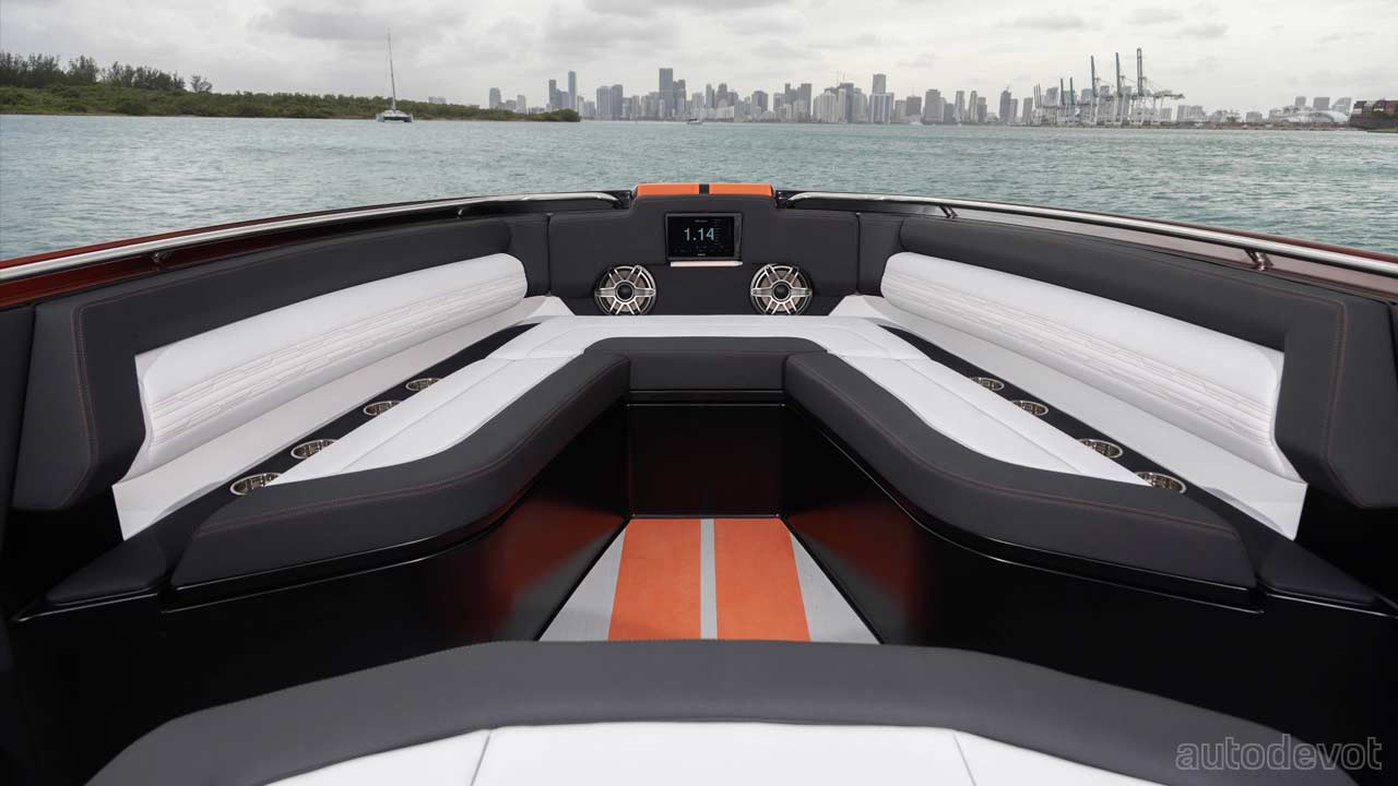 The grey and black theme onboard is complemented with orange highlights. Other key features include three Garmin 8617 multi-functional displays flush-mounted onto a dashboard CNC-cut from a solid block of aluminum; Audio Marine audio system, and six seats at the helm. The hardtop is made of carbon fibre, of course.