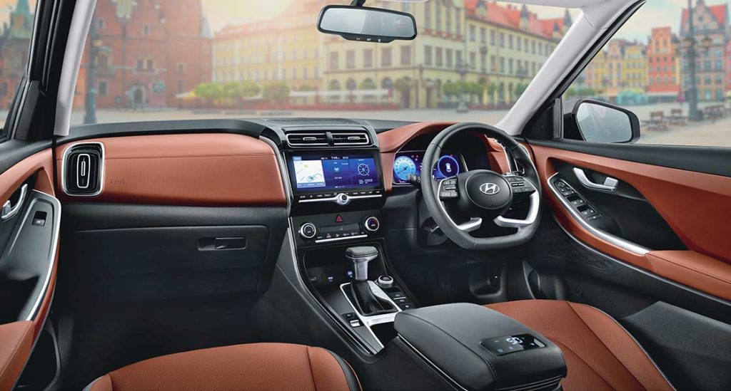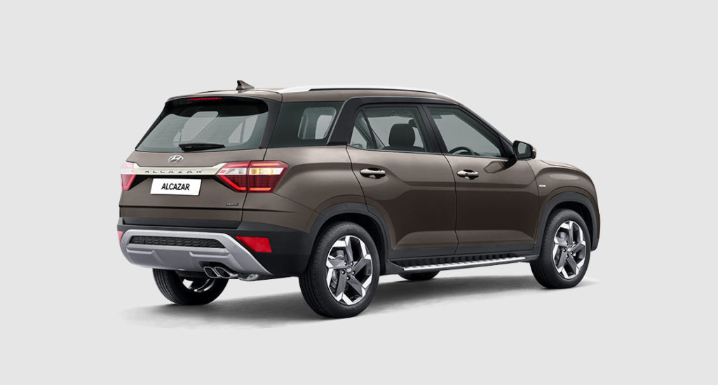 Exterior features depending on the trim include tri-beam LED headlights, LED taillights, ORVM-integrated LED turn signals, voice-enabled panoramic sunroof, and 18-inch alloy wheels. The Alcazar is available only in subtle exterior colors, including Taiga brown, Polar white, Phantom black, Typhoon silver, Starry night, and Titan grey. There are two dual-tone options as well: Polar white with Phantom black roof and Titan grey with Phantom black roof.